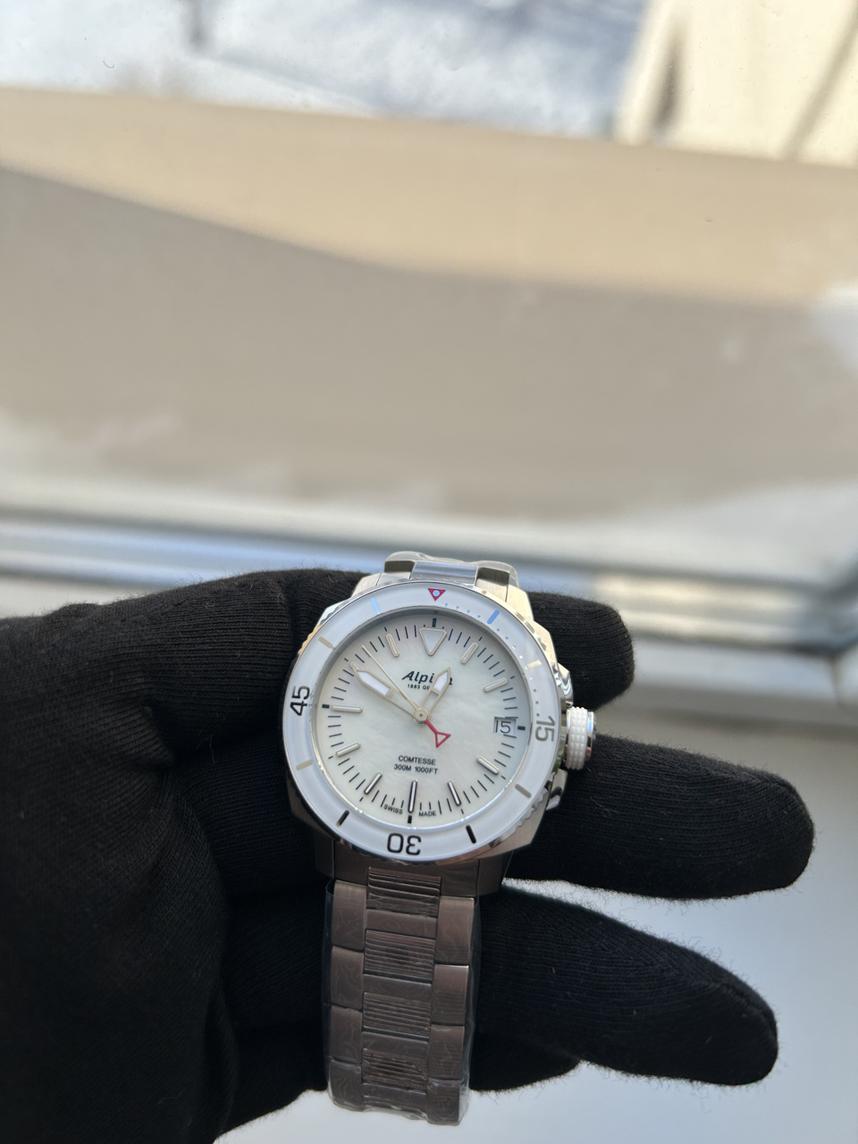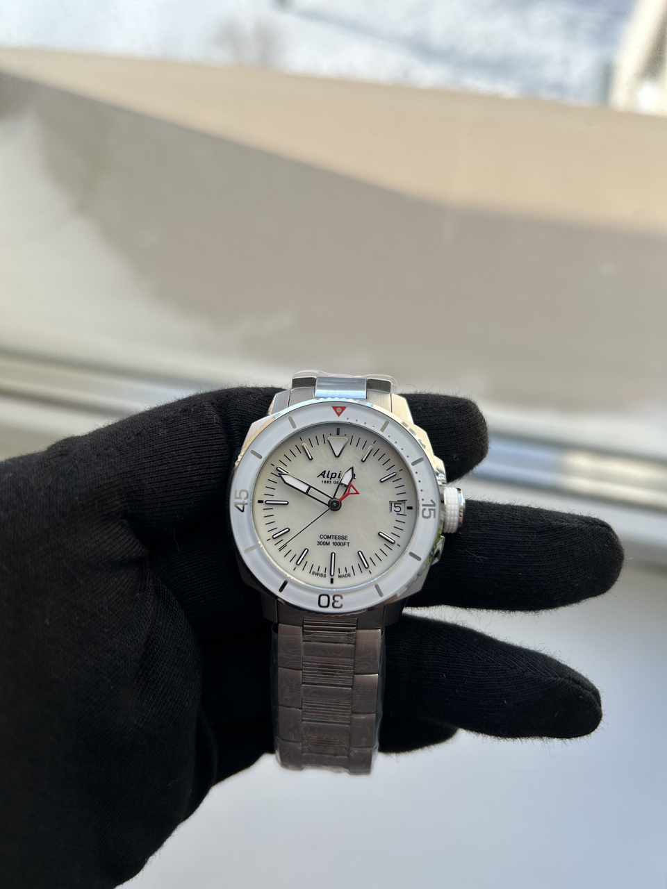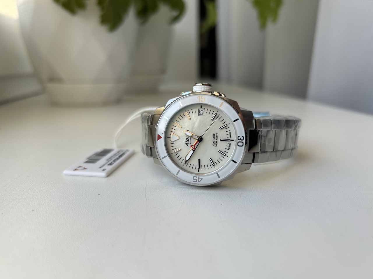 В продаже отличный женский дайвер от уважаемого производителя. Перламутровый цифер с накладными элементами, красиво переливающийся на солнце, швейцарский кварцевый калибр, отличный литой браслет. Суммарно имеем универсальный повседневник фактически без слабых сторон. В живую часы выглядят гораздо богаче и интереснее чем на фото. Ритейл $1295