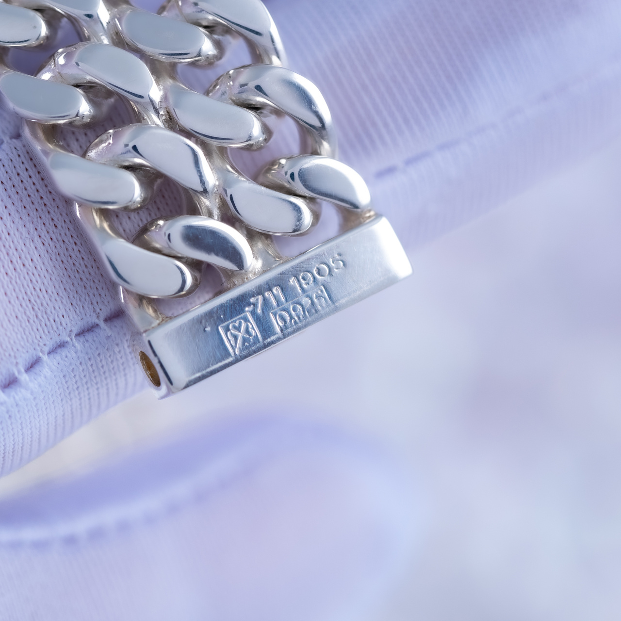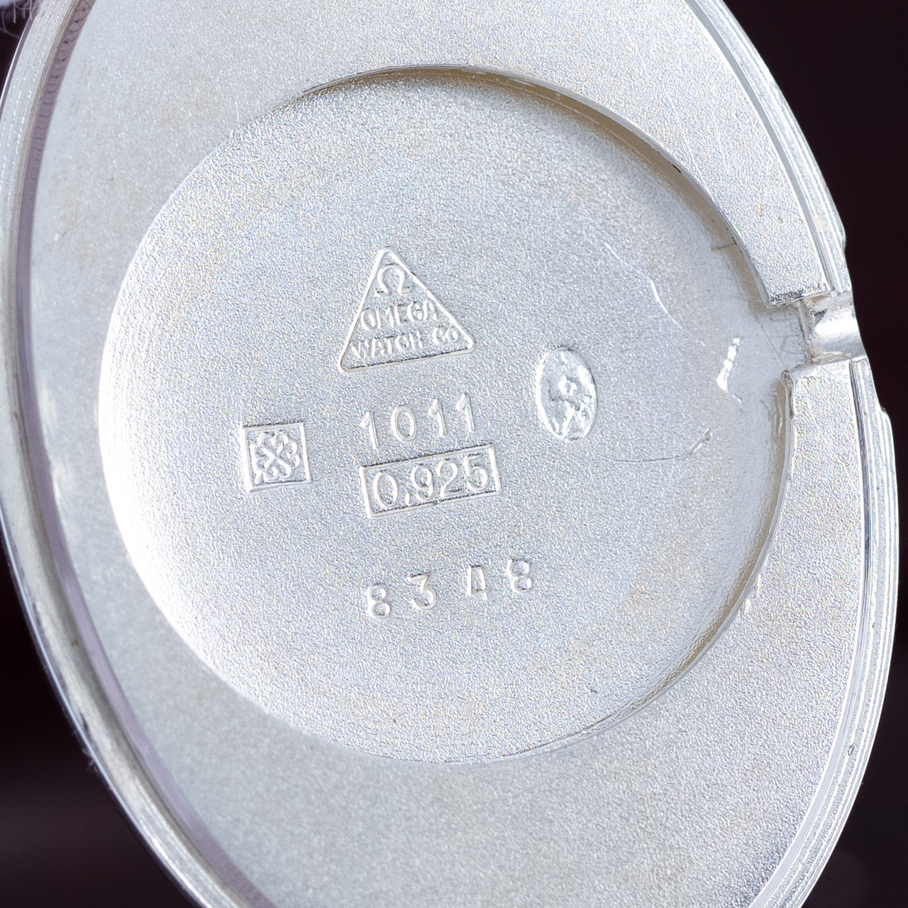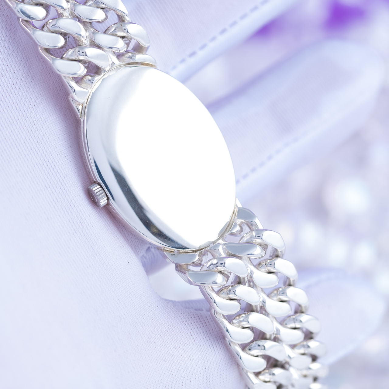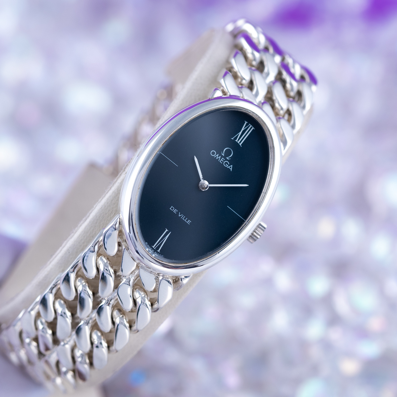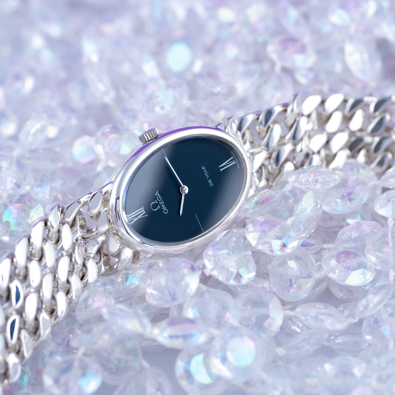 Эта винтажная модель Omega из серебра отличается темно-синим циферблатом в форме эллипса с тонкими белыми линиями и римскими цифрами-часовыми метками. Pоскошный серебряный браслет с кубинским плетением служит центральным элeментoм.