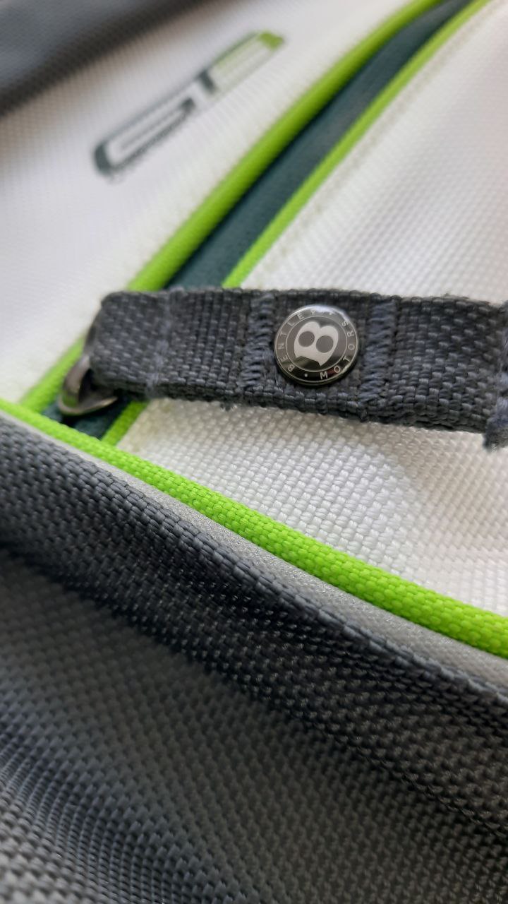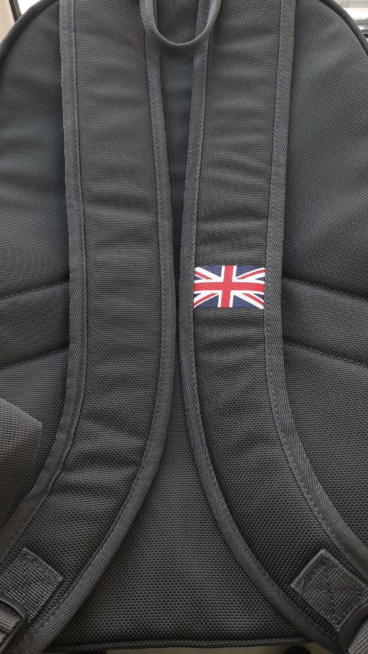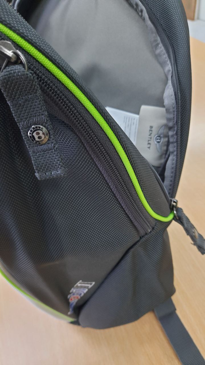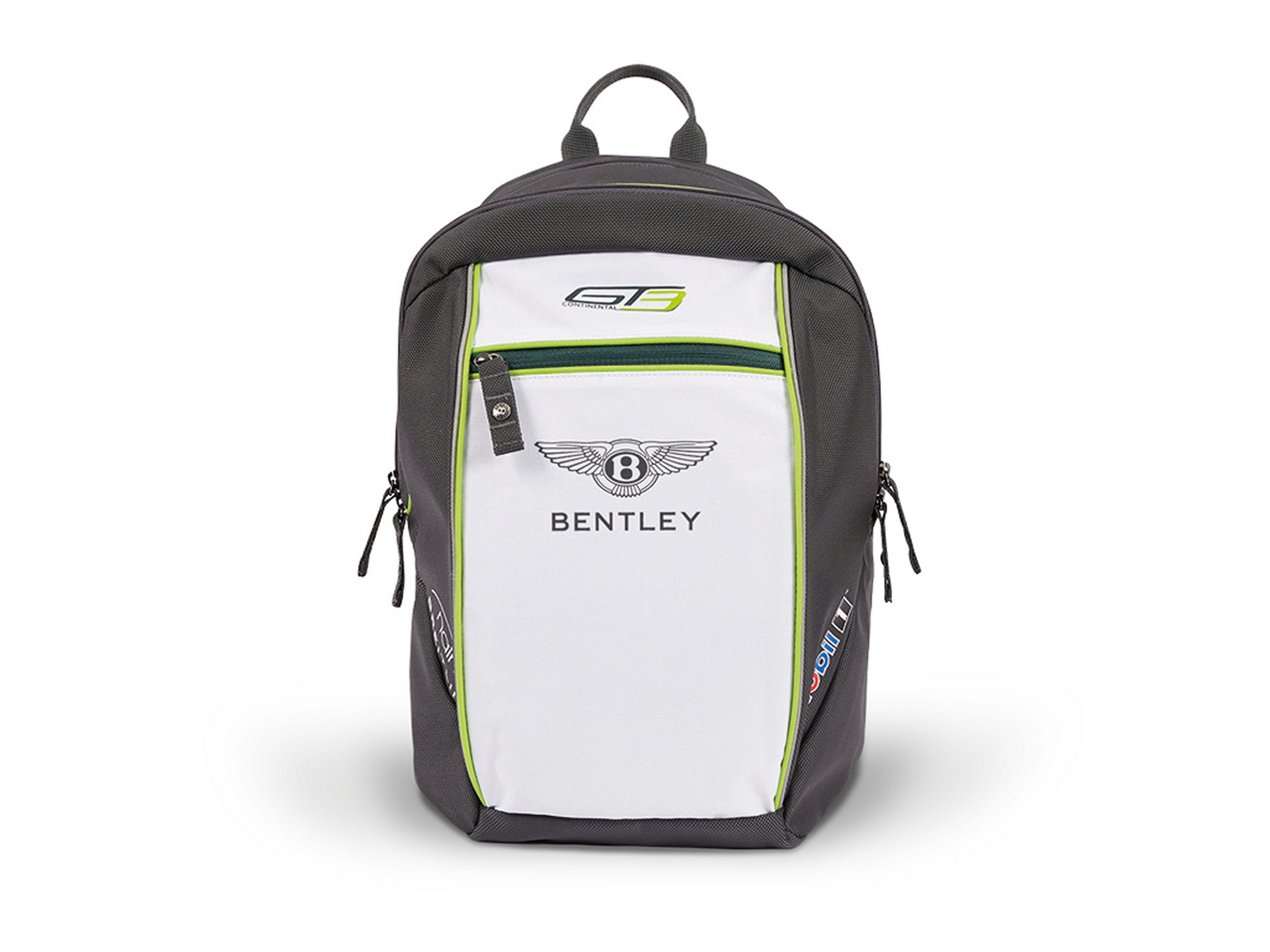 Эмблема Bentley и Continental GT3 размещена на лицевой стороне рюкзака, по бокам логотипы Naim, Breitling и Mobil 1 - партнеров гоночной команды Bentley. Британский флаг нанесен на левую лямку рюкзака, а бегунки молнии также несут на себе эмблему Bentley.
