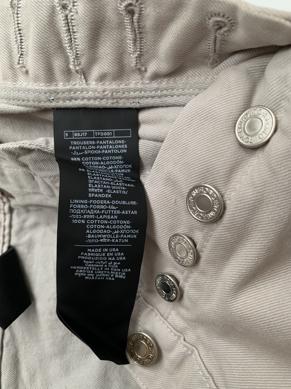 Модель слегка зауженного кроя Slim изготовлена из лёгкой,мягкой,хлопковой ткани с не большим количеством синтетических волокон,что придаёт дополнительную прочность изделию.Джинсы комфортно садятся по фигуре и не вытягиваются в области колен.Брюки светло-серого цвета имеют застёжку спереди на брендированные пуговицы-клёпки серебристого цвета.Верх классический,пятикарманный.Традиционный ярлык сзади на поясе с названием бренда выполнен из контрастной коричневой замши.
