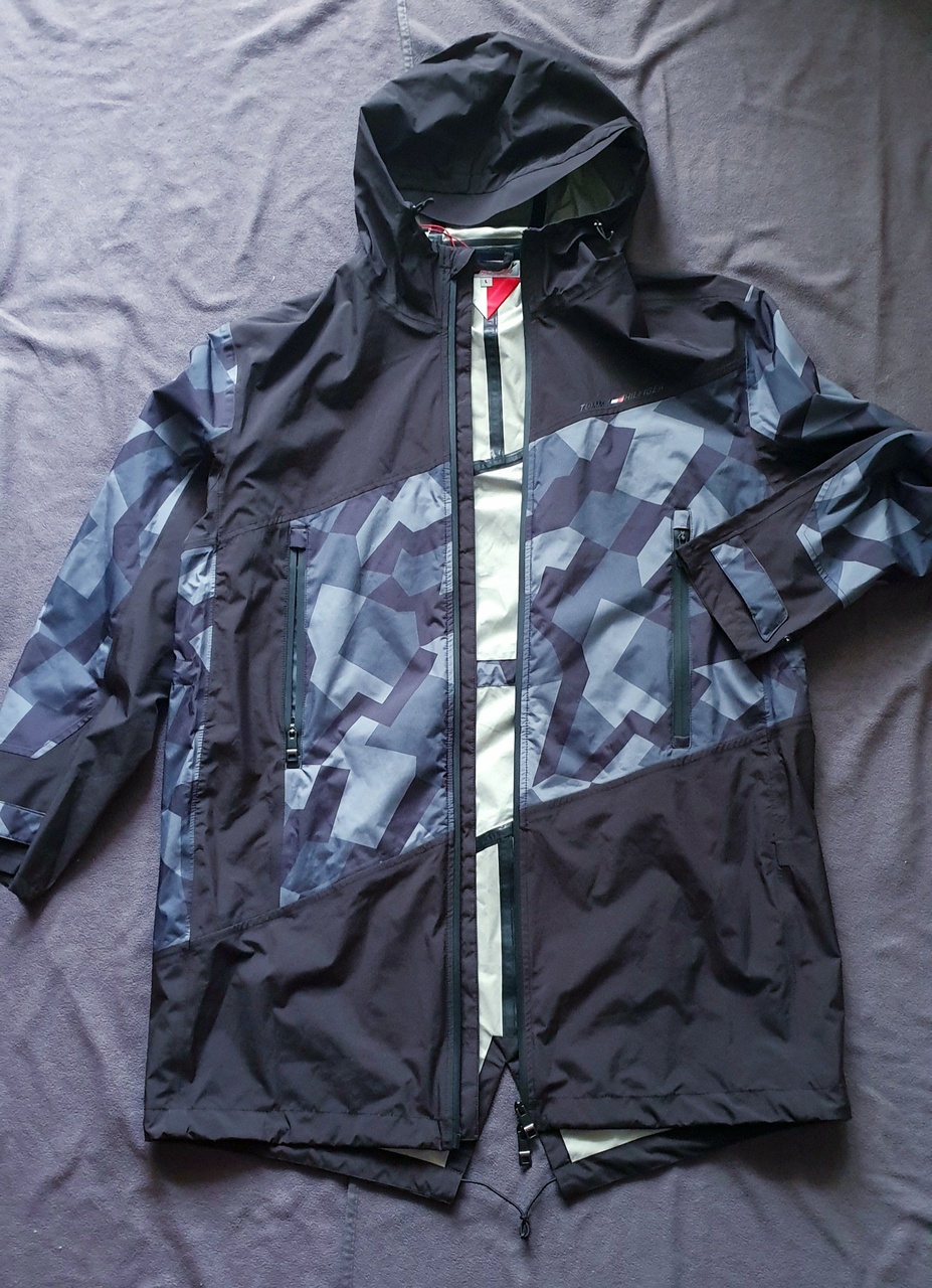 Конкретно с этой моделью Hilfiger попал в точку: спокойные и неброские цвета, принт оттенков серого, в сочетании с классическим кроем (так называемый fishtail) создают непреходящий дизайн. Куртка модная, но одновременно максимально утилитарная, простая и без навязчивых украшений, но притягивает внимание своей минималистической эстетикой. Можно по городу красиво прогуляться, либо на рыбалку по-взрослому с друзьями скататься, или отправиться на пробежку под дождиком - вещь работает.