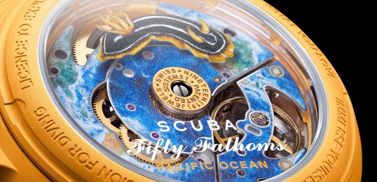 Часы коллекции Bioceramic Scuba Fifty Fathoms оснащены механизмом Swatch SISTEM51. Swatch SISTEM51, выпущенный в 2013 году, является первой и единственной механической ходовой системой, производство которой полностью автоматизировано. Этот механизм швейцарского качества состоит всего из 51 детали, которые закрепляются одним центральным винтом, и отличается высокой точностью хода за счет антимагнитных свойств пружины из материала Nivachron™. Традиционно Swatch предоставляет возможность рассмотреть механизм SISTEM51 через прозрачную заднюю крышку. На каждой из пяти моделей коллекции Bioceramic Scuba Fifty Fathoms можно увидеть изображение одного из удивительных и ярких голожаберных моллюсков, обитающих в пяти соответствующих океанах. Картинки животных нанесены методом цифровой печати на ротор механизма, который обеспечивает автоматическую подзарядку часов при движении руки.