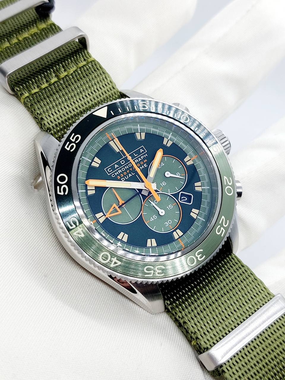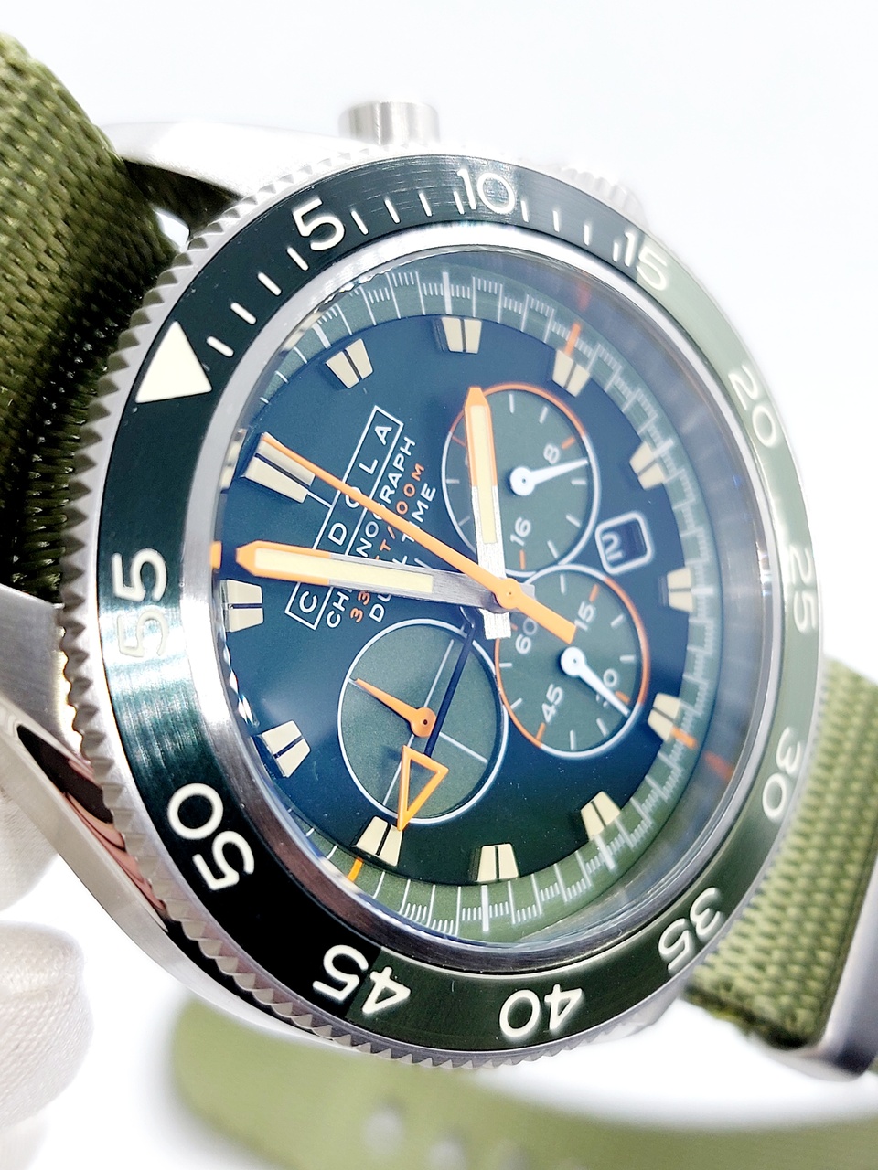 Зелёный циферблат с центральными мечевидными стрелками на которые нанесен светонакопительный состав Super-LumiNova.
