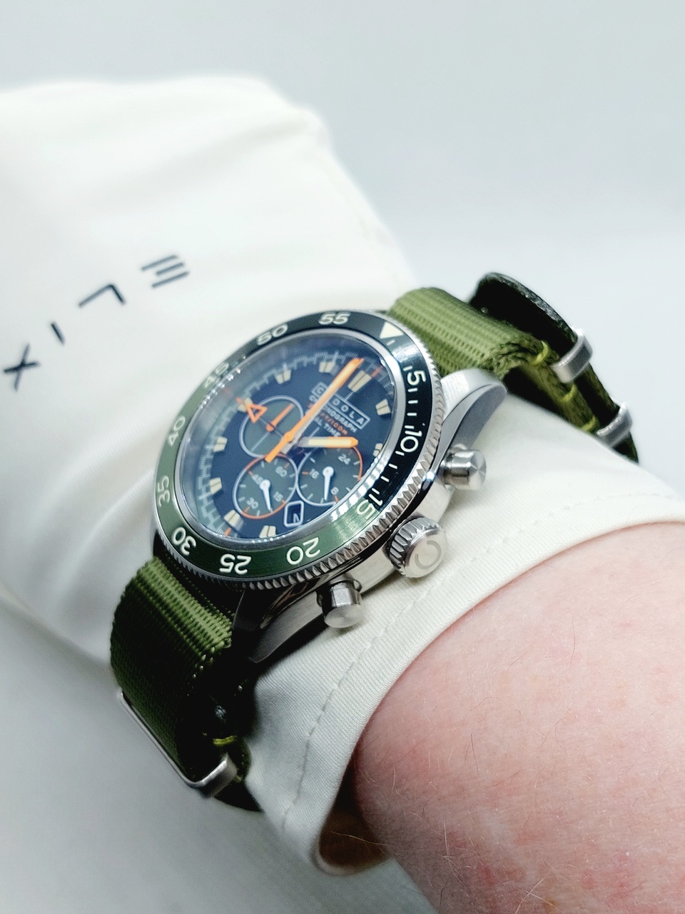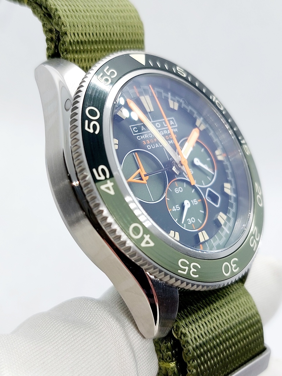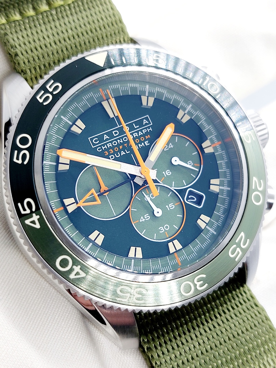 Минутные и секундные метки в виде длинных штрихов белого цвета расположены по внешнему диаметру с зелёным кольцом.