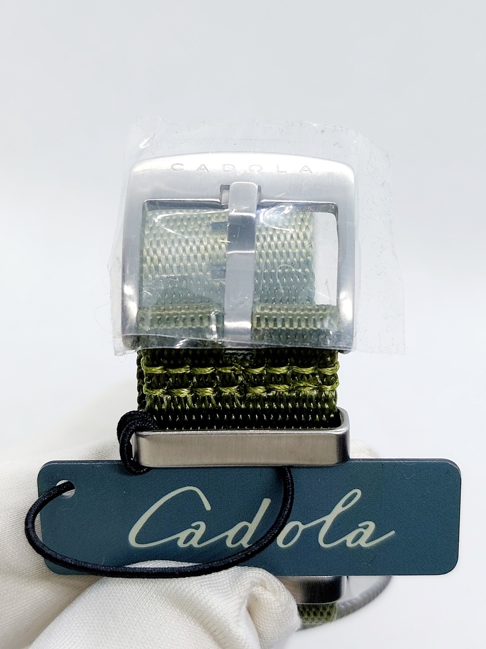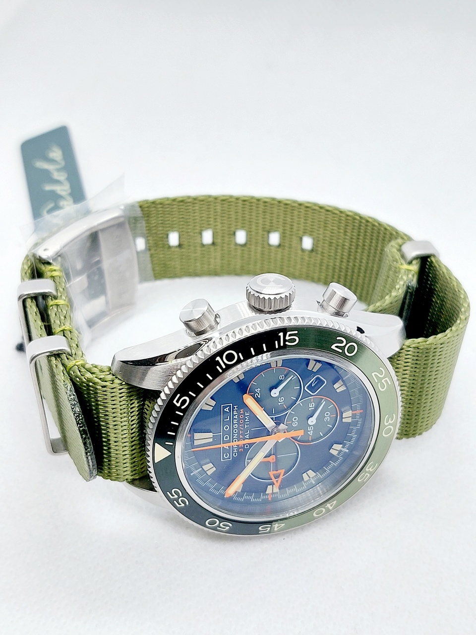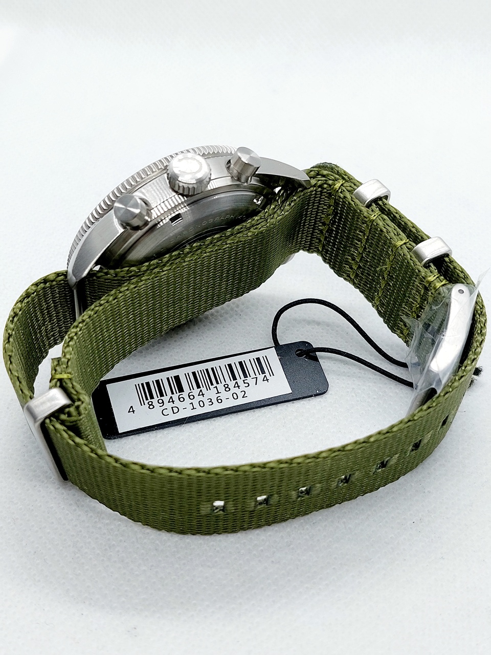 Часы комплектуются нейлоновым зеленым ремешком с классической застёжкой на которой нанесён логотип бренда.