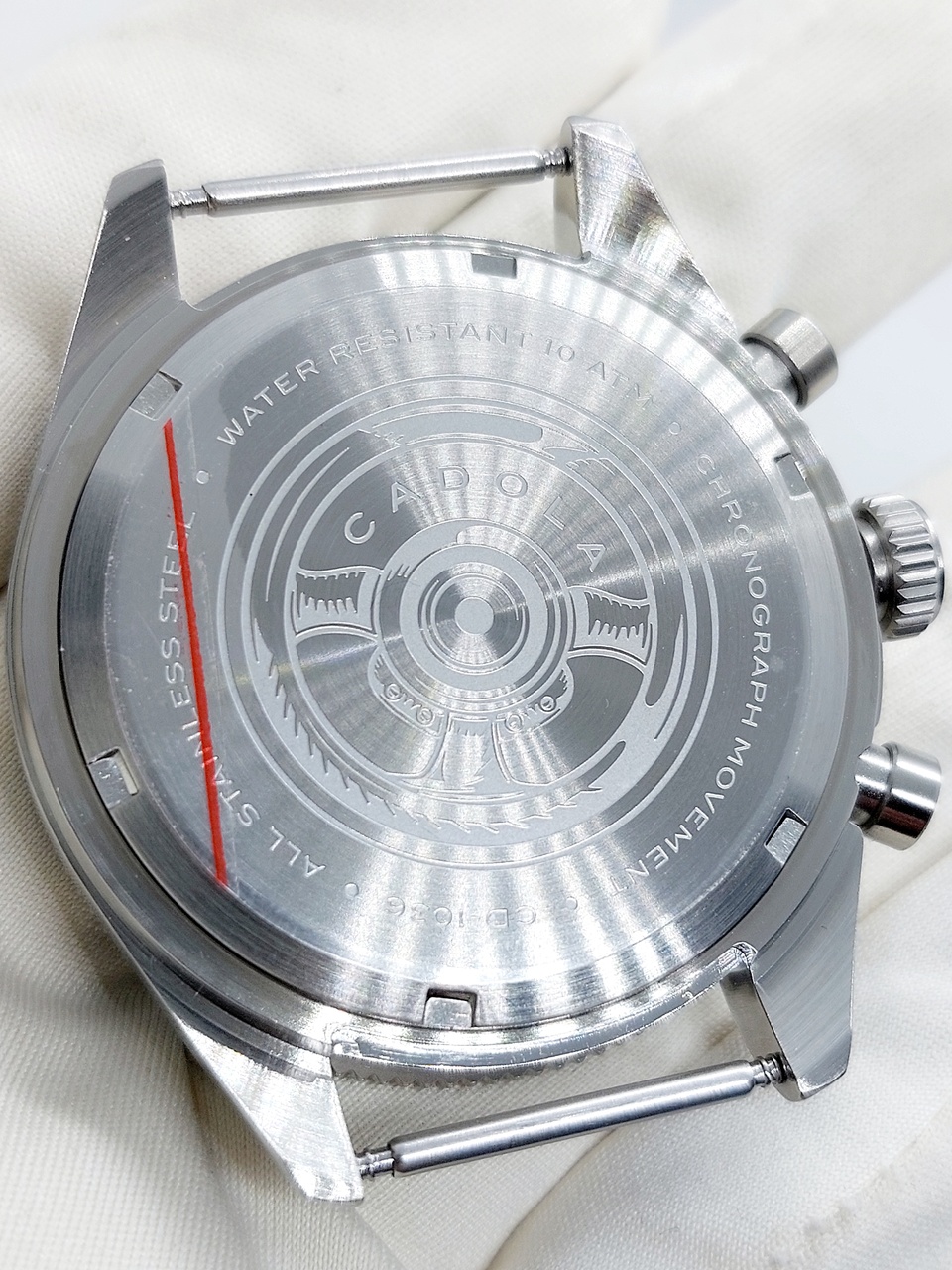 Пушеры управления хронографом расположены справа, по краям от заводной головки.