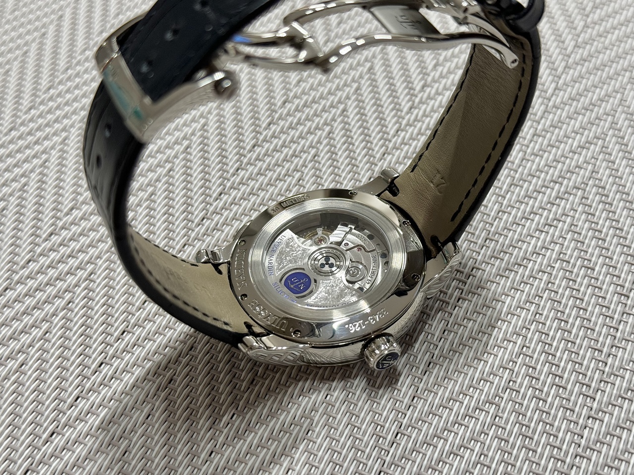 Шикарный мануфактурный калибр UN-334. Запас хода 48 часов. Большая дата. Окошко 24-часового прыгающего указателя времени второго часового пояса.