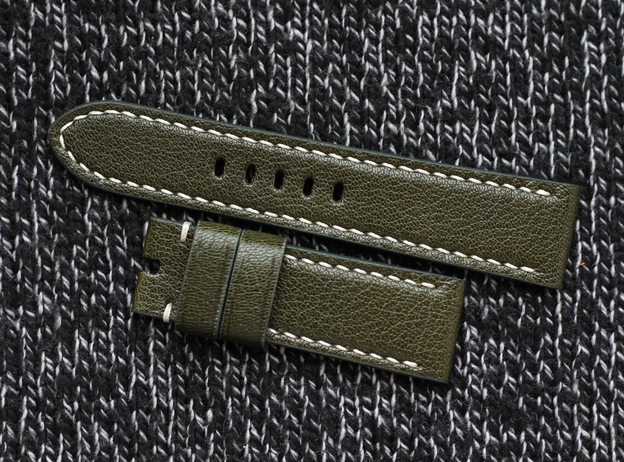 Бутылочная коза от Antiba. Хромовое дубление, потрясающая фактура и выделка. Бежевая косая строчка экрю. Ширина 24/22 мм, длина 125/75 мм, толщина около 3.5-4 мм, мягкий. Подклад из черной гипоаллергенной козочки Falco Pellami, края окрашены полиуретановой матовой краской в цвет. Выделка лица и подклада - Италия. Две шлевки, подвижная и вшитая.