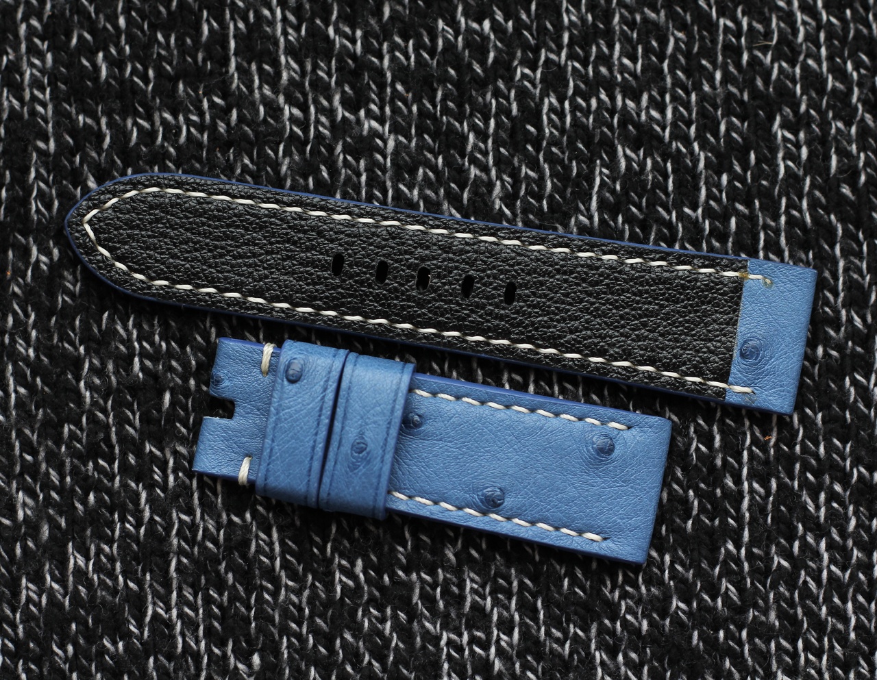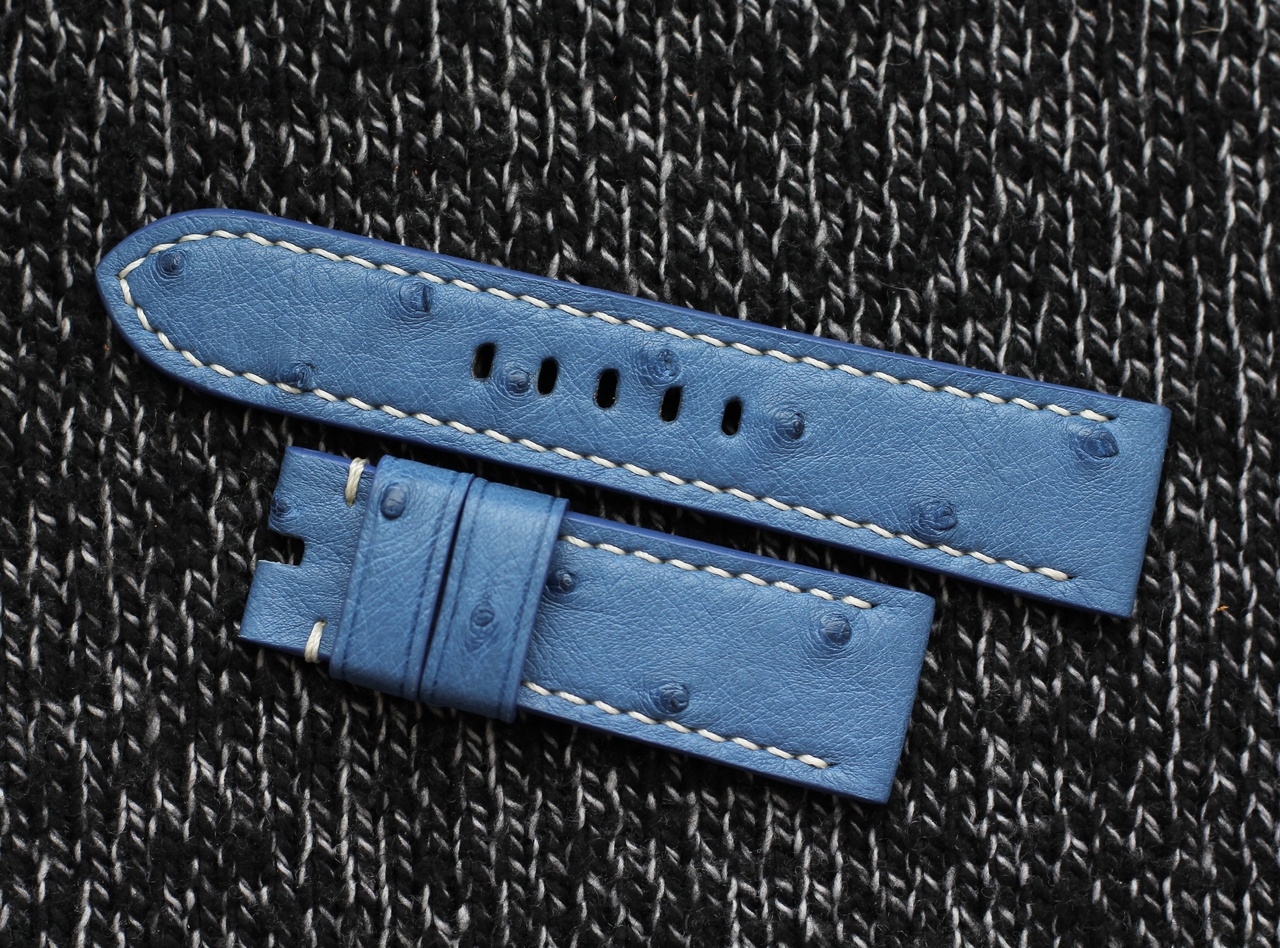 Синий страус с фолликулами. Классическая выделка. Косая строчка цвета экрю. Ширина 24/22 мм, длина 125/75 мм, толщина около 3.5-4 мм, мягкий. Подклад из черной гипоаллергенной козочки Falco Pellami, края окрашены полиуретановой матовой краской в цвет. Выделка лица и подклада - Италия. Две шлевки, подвижная и вшитая.