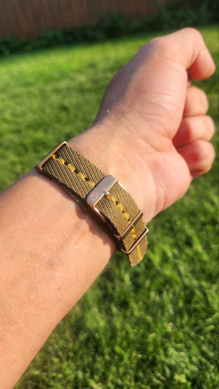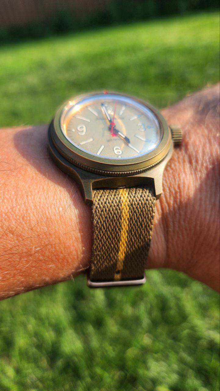 Я бы этот ремешок, несмотря на нелюбовь к НАТО, и оставил, если бы не стальная фурнитура в нитриде титана «под розовое золото»., которая совершенно не сочетается с бронзой.