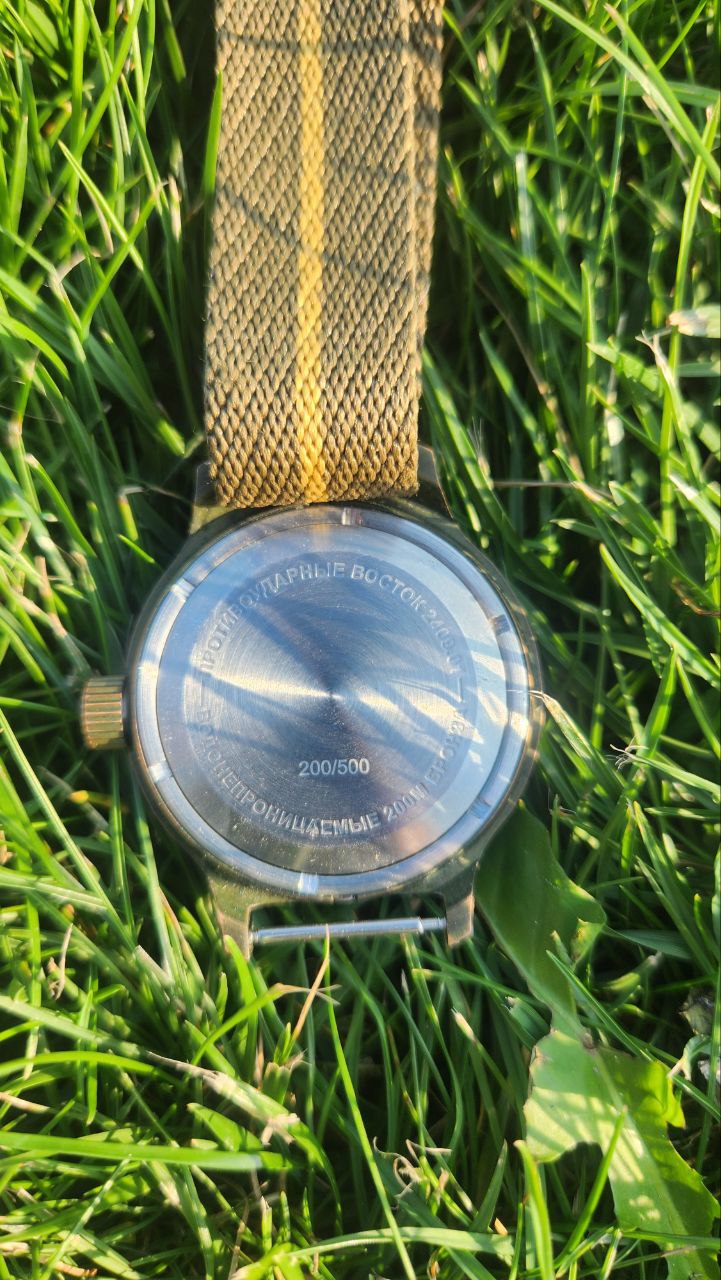 Один ремешок я просил синий с белыми нитками для Востока Тройки, а второй – оливково-защитный с желтой прострочкой под бронзовые Командирские. Оба просил с быстросъёмом. Часы с текущими ремешками Артёму показал, для бронзовых часов написал, что ремешок должен быть в цвет стокового.