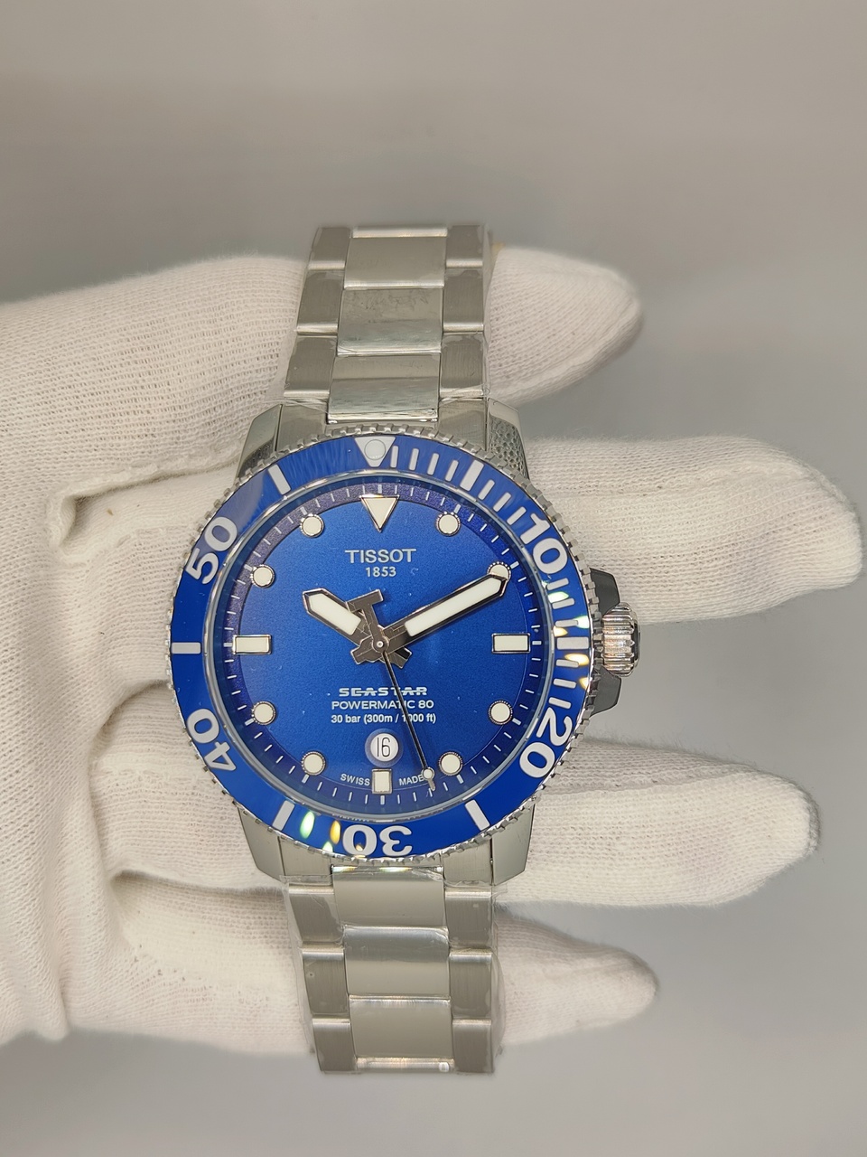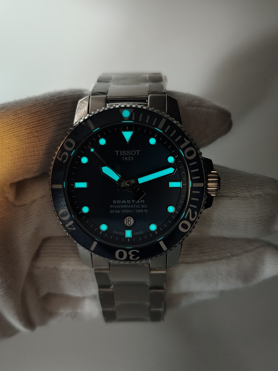 Tissot Seastar в дайверском стиле для ежедневного ношения подойдет не только под гидрокостюм или смокинг, но прекрасно будет смотреться и с шортами. 300-метровая водозащита выдерживает не только мытье рук но и погружение до 300 метров с тазом бетона, без потери герметичности. Сапфировое стекло убережет от царапин отравленным стилетом. Механизм Powermatic 80.811, являясь высококлассной "рабочей лошадкой", не только будет радовать взор через открытую заднюю крышку, но и будет так же исправно ходить в понедельник утром, перед любимой работой.