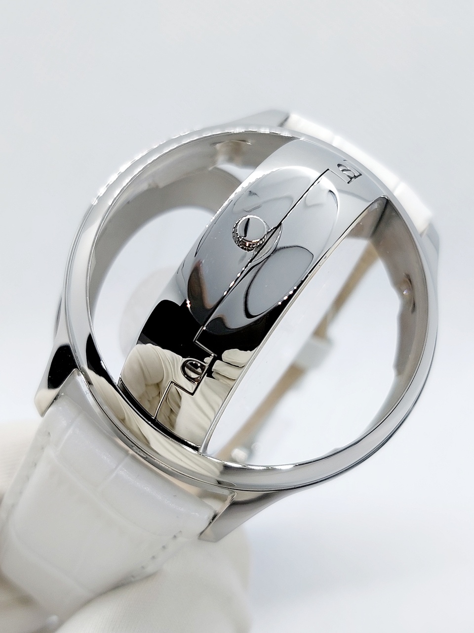 Часы оснащены кожаным ремешком белого цвета с раскладывающейся застежкой бабочкой из нержавеющей стали, на которой нанесен логотип бренда.