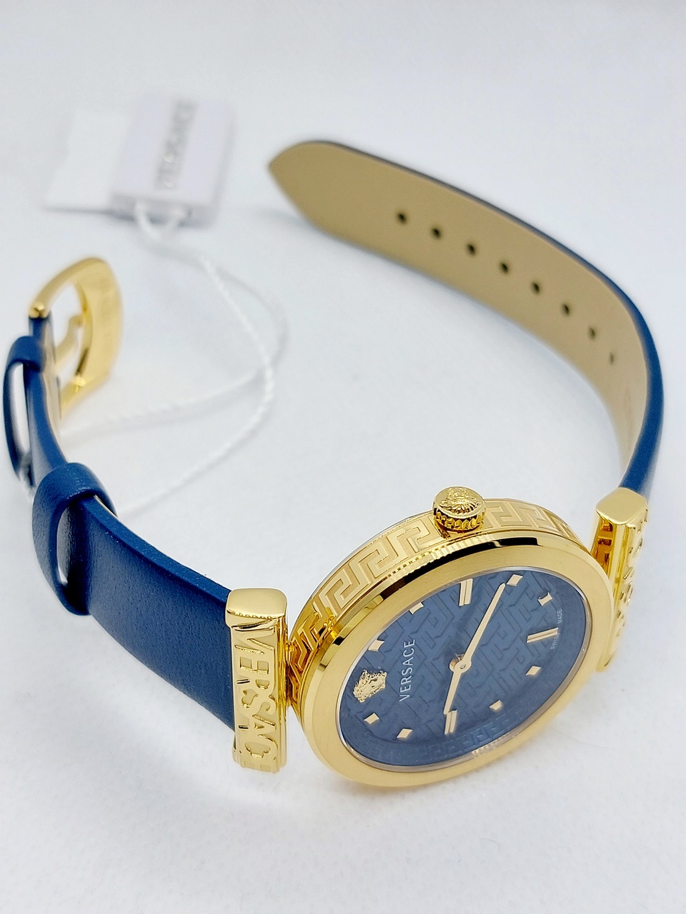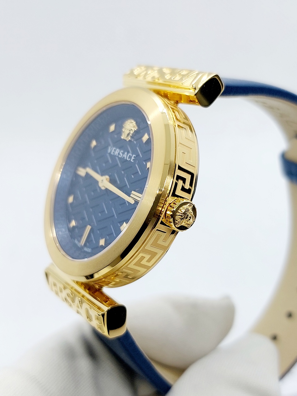 Боковая поверхность корпуса украшена гравировкой древнегреческого орнамента Меандр, одной из отличительных деталей бренда Versace.