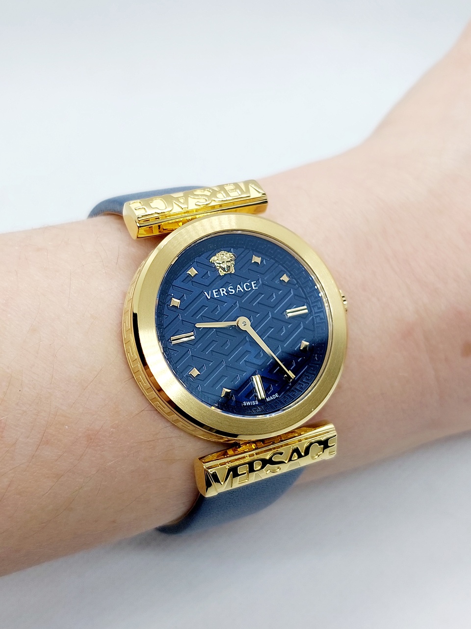 Очень красивой и важной деталью в этих часах являются золотистые ушки с капюшоном, они же зачехленные ушки с объемным названием бренда VERSACE.