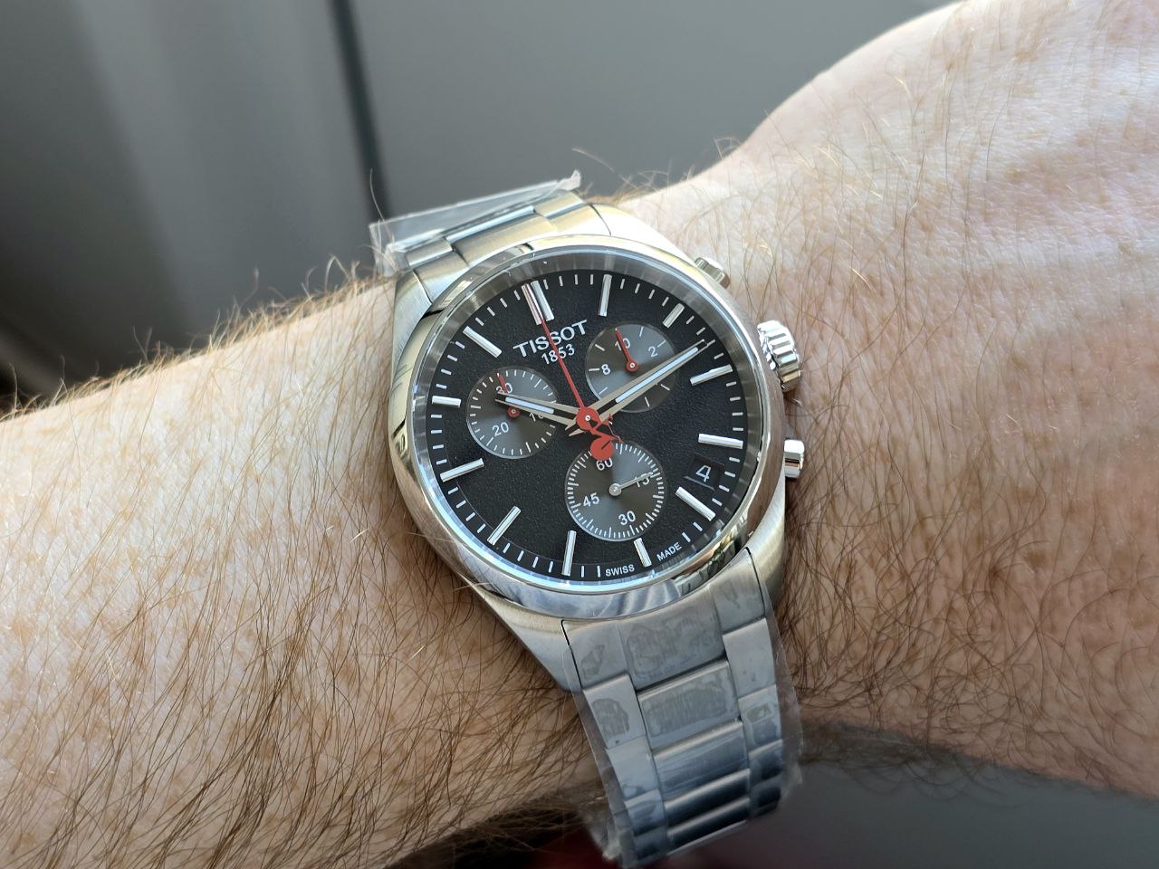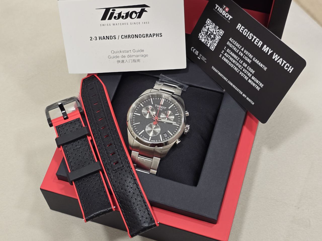 Чёрно-красные акценты, текстурированный под асфальт циферблат, секундная стрелка с велосипедистом и дополнительный ремешок с рисунком под рукоятки велосипеда.