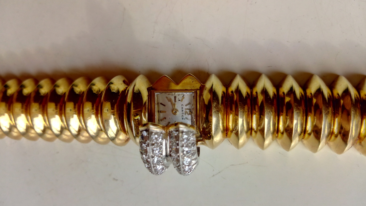 Винтажные часы – браслет Cartier. Сделаны в 50- 60 х годах. Часы механика полностью исправны. Золото 750 проба, Бриллианты , общий вес 87 г. (вместе с механизмом). Хороший экземпляр в коллекцию. Часы этой серии были популярны, но выпущены не большим тиражом, некоторые экземпляры есть на западных аукционах, цена на них начинается от 15 000 долларов. (скрин с предложением, смотрите в фото)