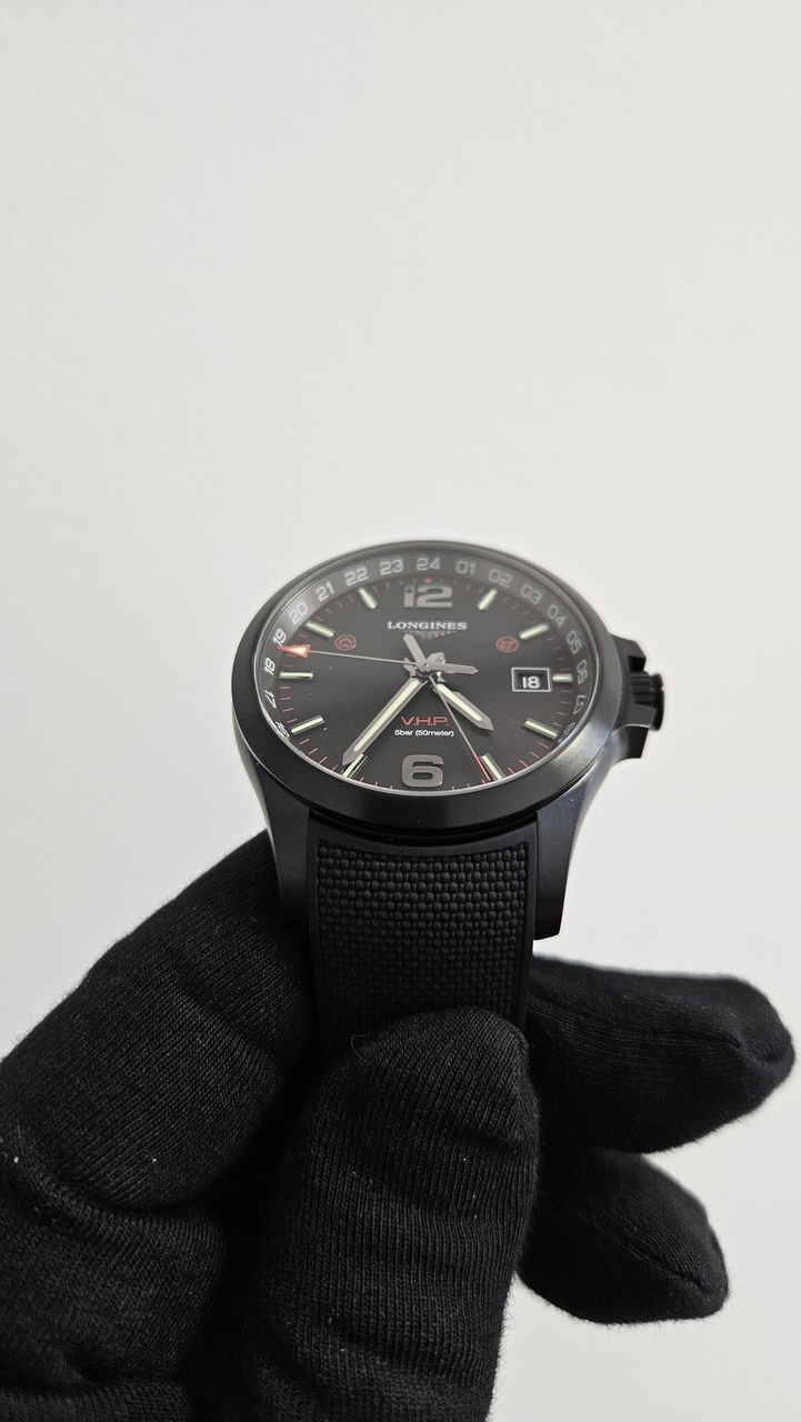 Механизм: В механизме использована технология V.H.P., разработанная ETA специально для Longines, которая обеспечивает повышенную точность хода часов, а также системы автокорректировки показаний после ударов (до 500 g) и воздействия магнитного поля. Антибликовое покрытие стекла, корпус - черное PVD-покрытие, завинчивающаяся задняя крышка. Второй часовой пояс в 24-часовом формате времени