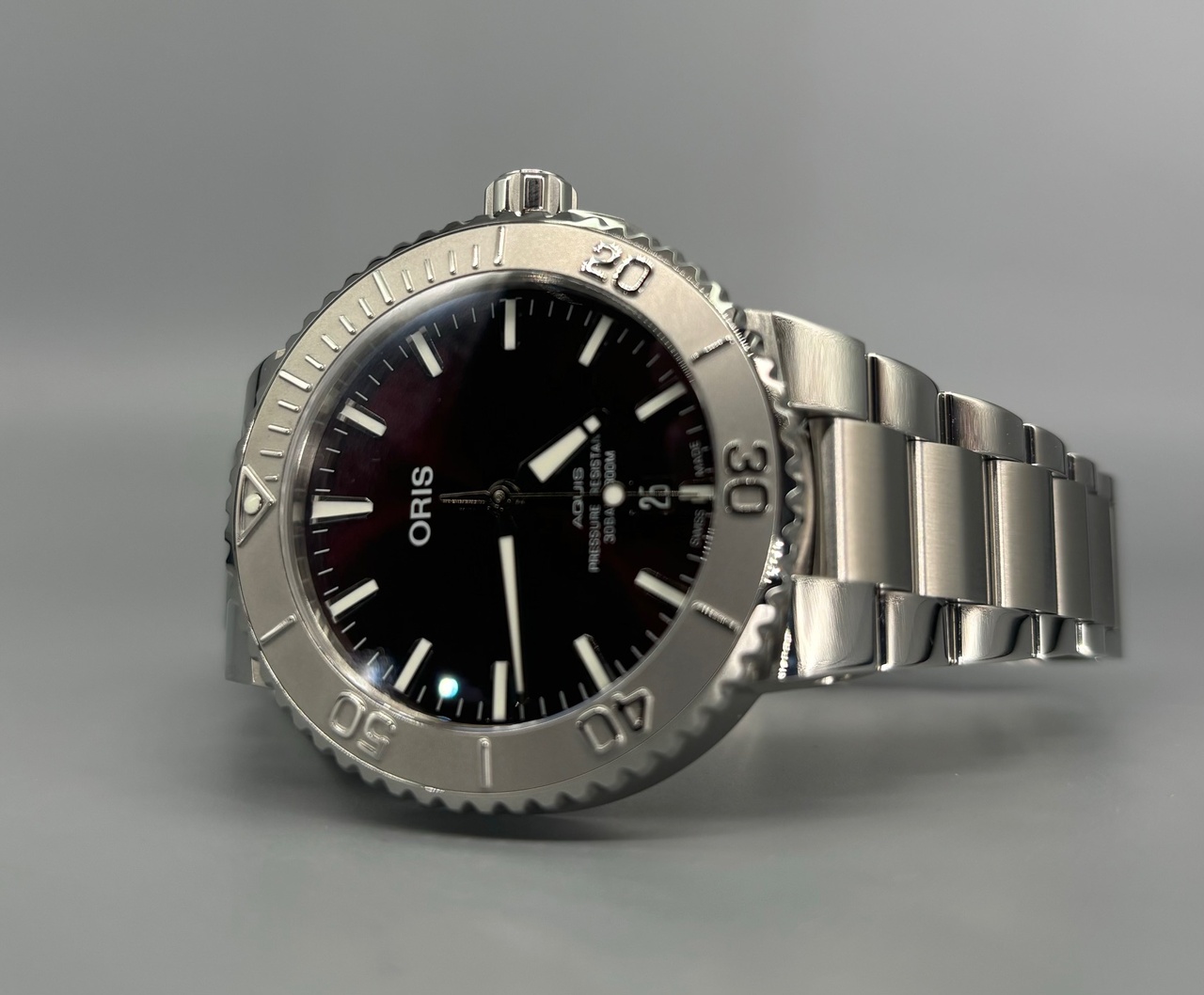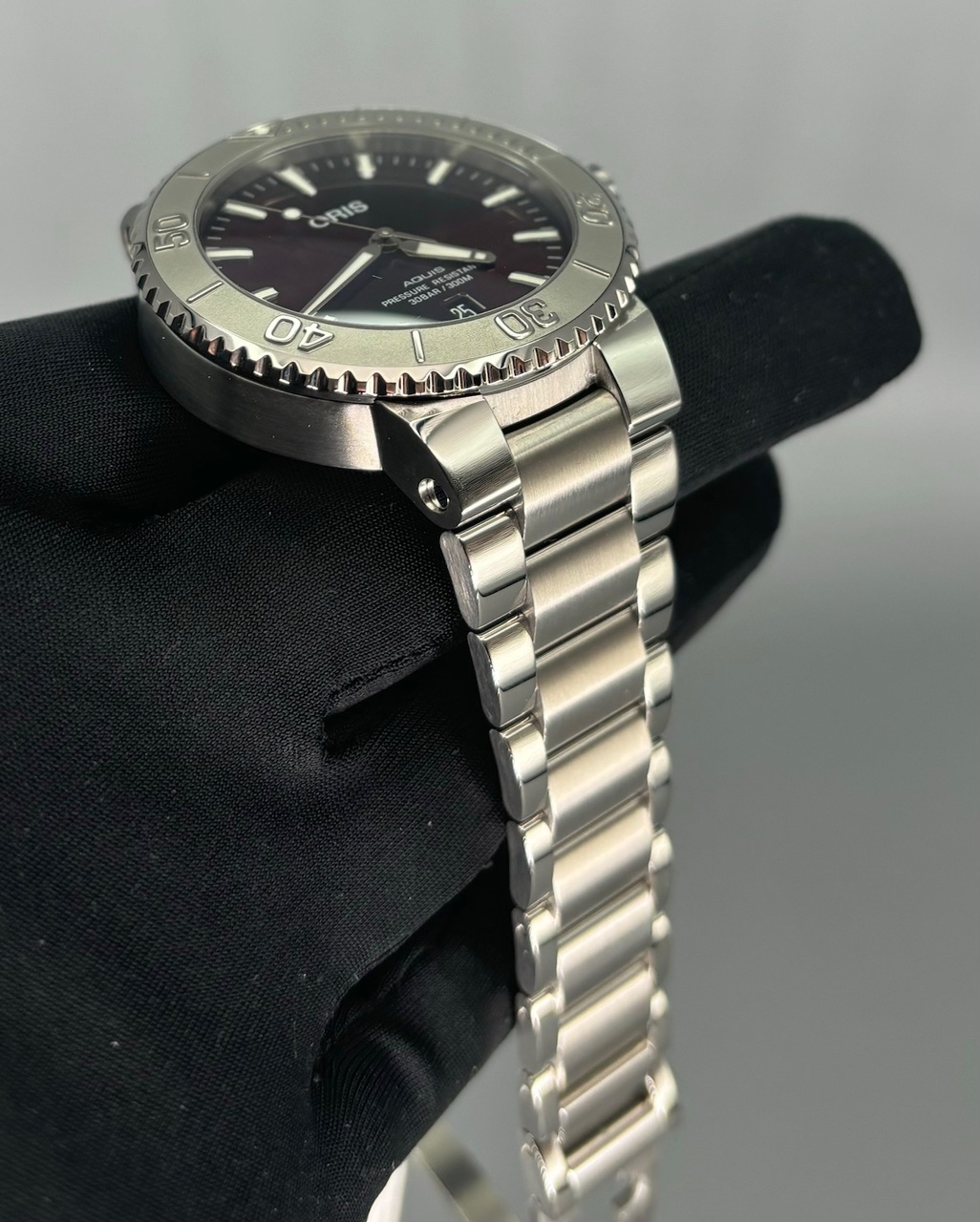 Представленная дайверская модель Aquis имеет рельефный безель со вставкой из нержавеющей стали, который смотрится стильно и значительно отличается от обычного с керамической вставкой. В окружении рельефного безеля красивейший вишневый красный циферблат. Вообще Aquis уже давно завоевал себе лидирующее место среди коллекций Oris и отлично конкурирует с дайверами других производителей, благодаря своему стилю и качеству, разумной цене и превосходному внешнему виду. А темно-красный цвет, постепенно после синего и зеленого, все больше завоевывает свое место в палитре часовых циферблатов.