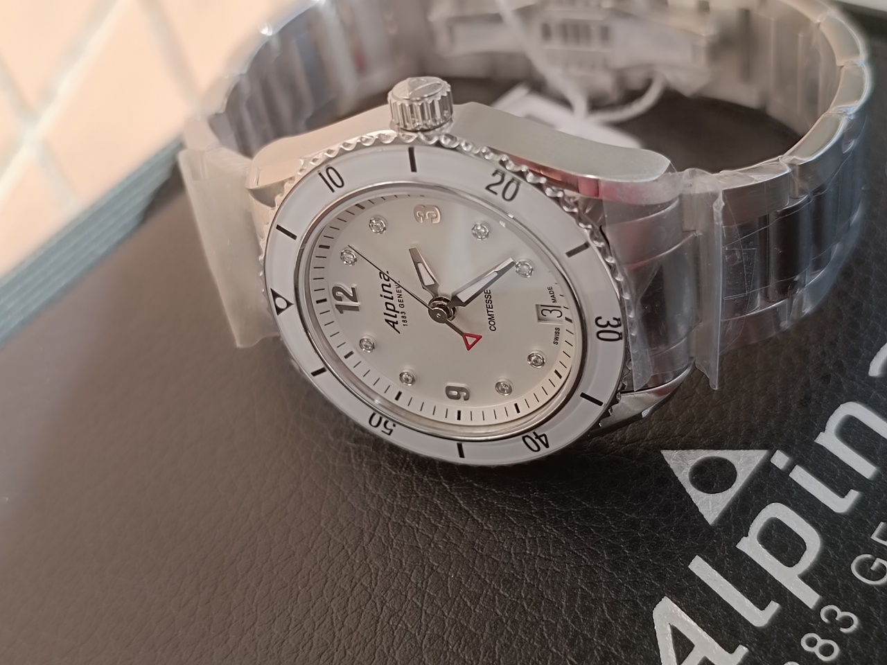 Женские кварцевые часы ALPINA COMTESSE SPORT//8 бриллиантов//36 мм//белый циферблат//браслет//белое на белом//