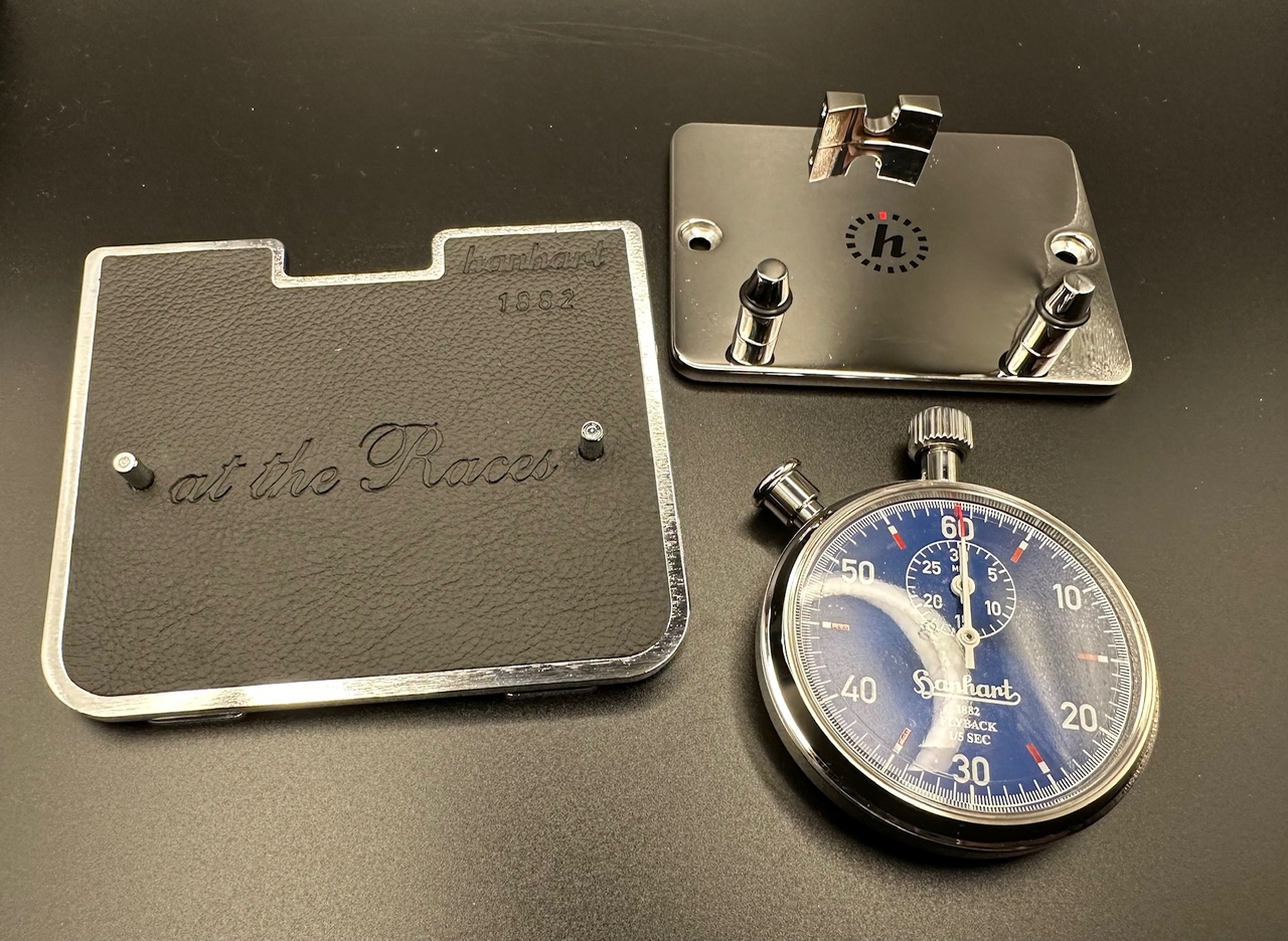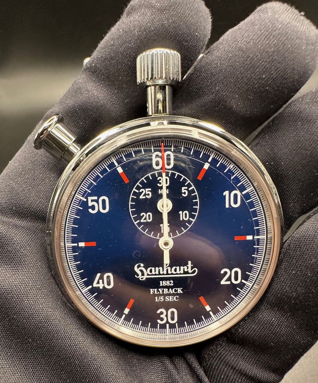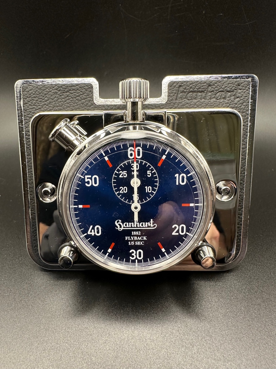 В секундомере, который также, как и часы, оснащен функцией Flayback, установлен собственный механизм Hanhart — caliber 122, стекло секундомера пластиковое.