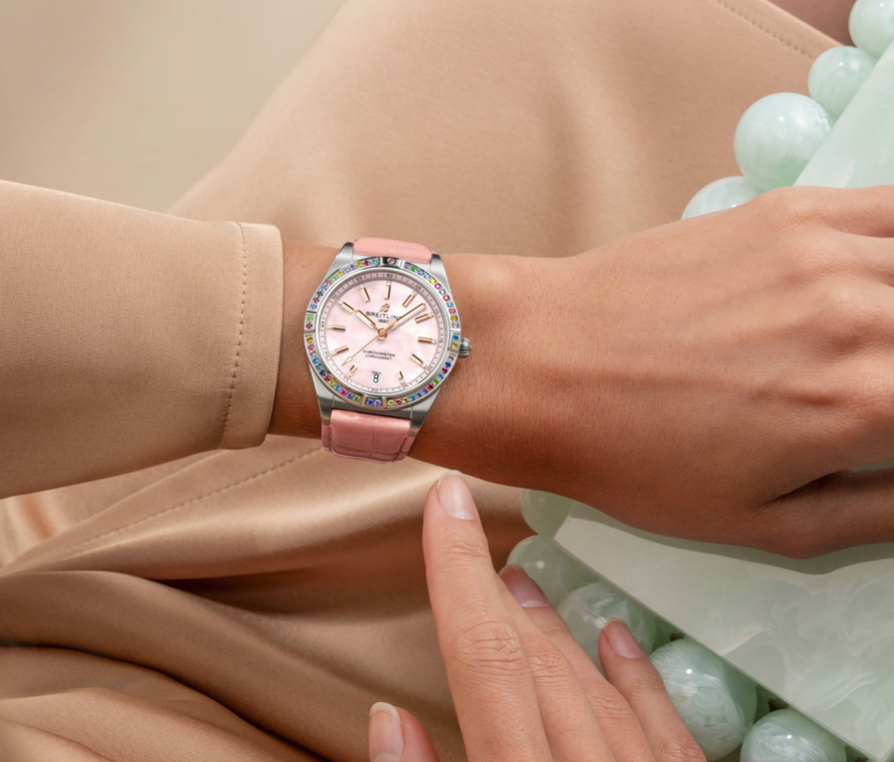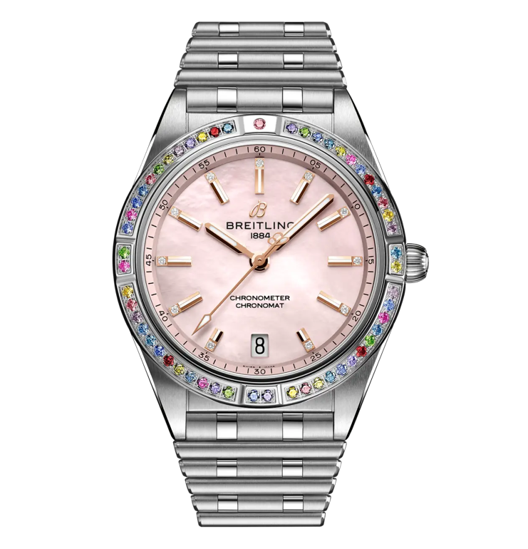 РЕДКИЕ ЖЕНСКИЕ *BREITLING* CHRONOMAT AUTOMATIC 36 ММ SOUTH SEA Ref: G10380BB1K1G1/РОЗОВЫЙ ЦИФЕРБЛАТ/БРИЛЛИАНТЫ НА ЦИФЕРБЛАТЕ/РАЗНОЦВЕТНЫЕ ДРАГОЦЕННЫЕ КАМНИ НА БЕЗЕЛЕ