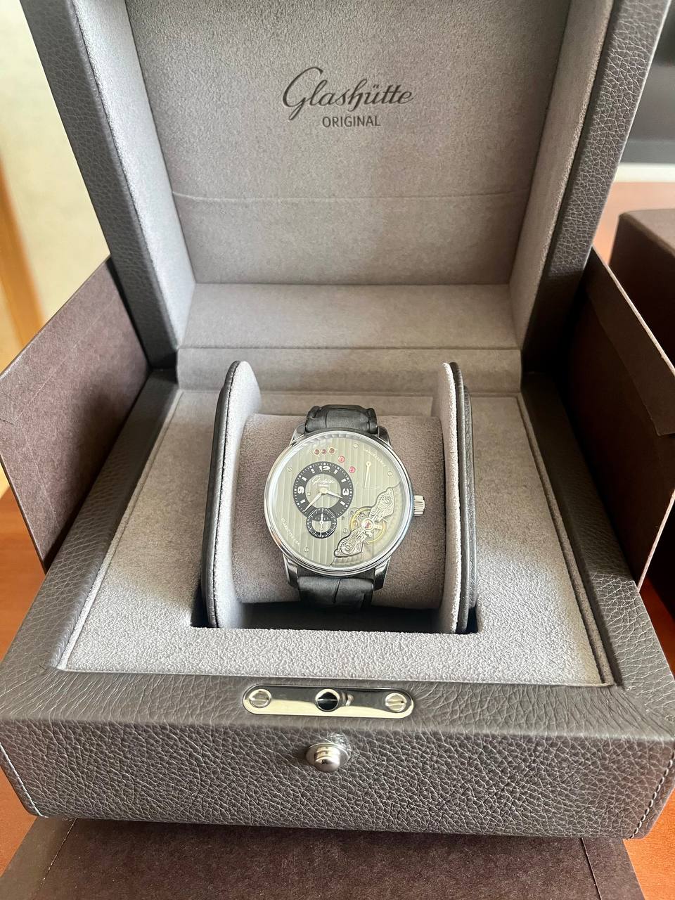 Комплектация: фирменная кожаная коробка Гласхютте последнего образца, включая чехол-переноску, документы (инструкция к калибру 66), новый фирменный кожаный ремень Гласхютте, неношенный.