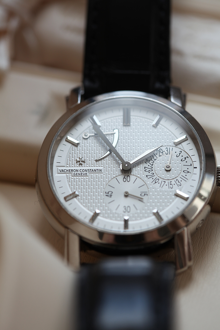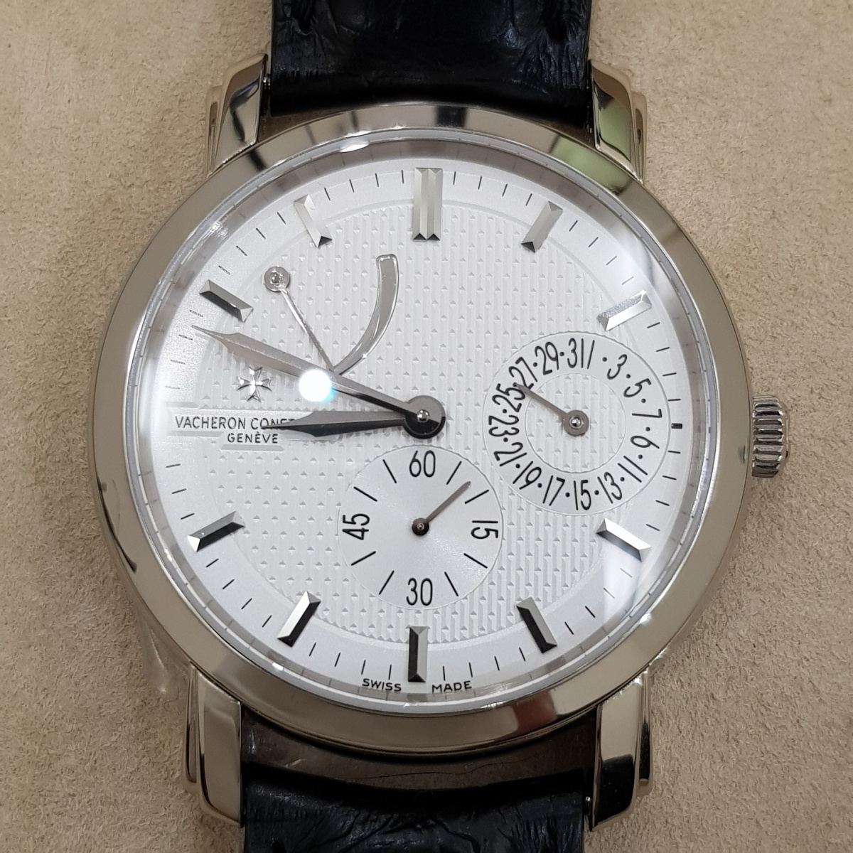Циферблат: «Silver Linear Guilloche Texture»; малые циферблаты декорированы в стиле grene; стрелки, накладные часовые метки, римские цифры и логотип - из золота; минутная шкала нанесена способом шелкотрафаретной печати