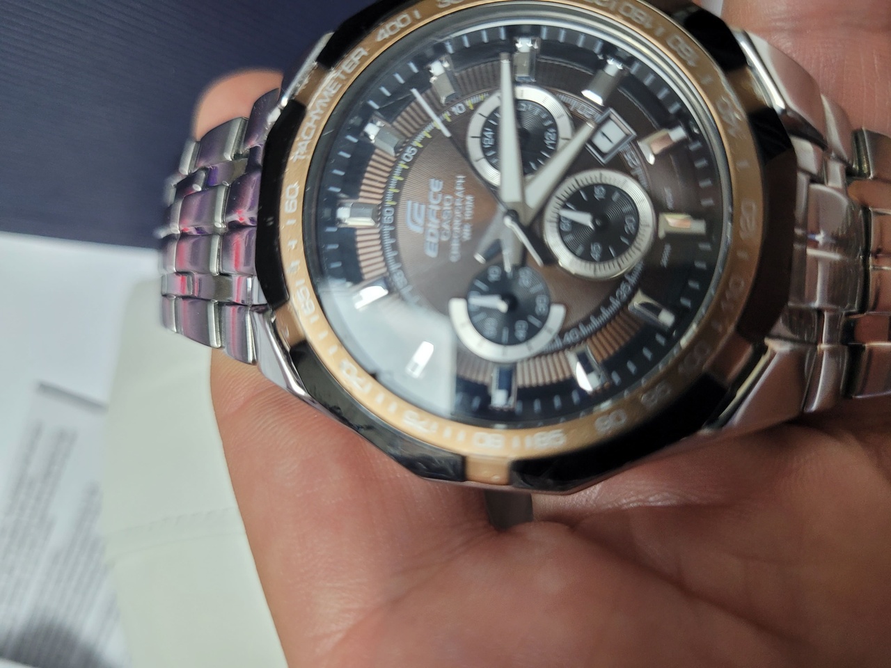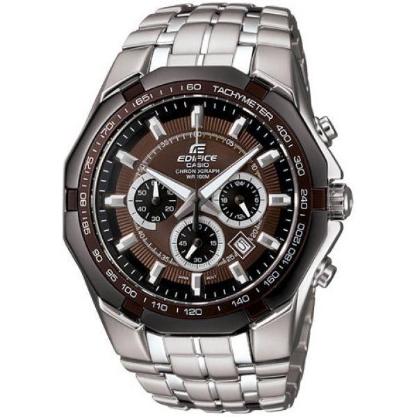 Представляю Вашему вниманию японские наручные часы Casio Edifice EF-540D-5A с хронографом. Стильные мужские наручные часы Casio Edifice надежные и практичные. Кварцевый японский механизм Miyota. Точность хода не хуже -10 +15 сек./в месяц. Часы оснащены функцией хронографа и тахиметра. Циферблат шоколадного цвета с контрастными индексами. Безель с IP покрытием коричневого цвета. Стрелки и индексы с светонакопительным нанесением. Корпус и браслет выполнены из высококачественной стали с антикоррозийными свойствами. Минеральное стекло устойчиво к появлению царапин. Водонепроницаемость 100М.