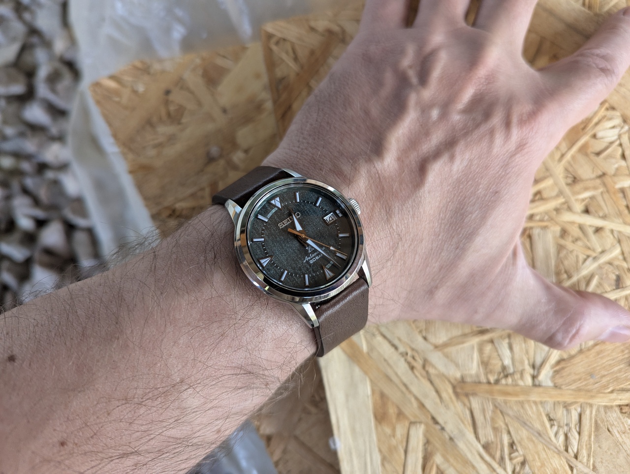 На моих фотографиях позирует с коричневым ремешком, сшитым на заказ у Брусницина. Могу его тоже отдать за дополнительную плату. Мне он нравится на порядок больше штатного ремешка.