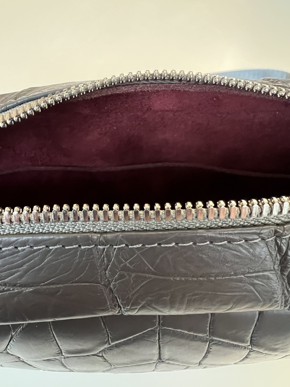 Внутри отделка из натуральной замши бордового цвета, в сочетании с серым крокодилом -это топ!