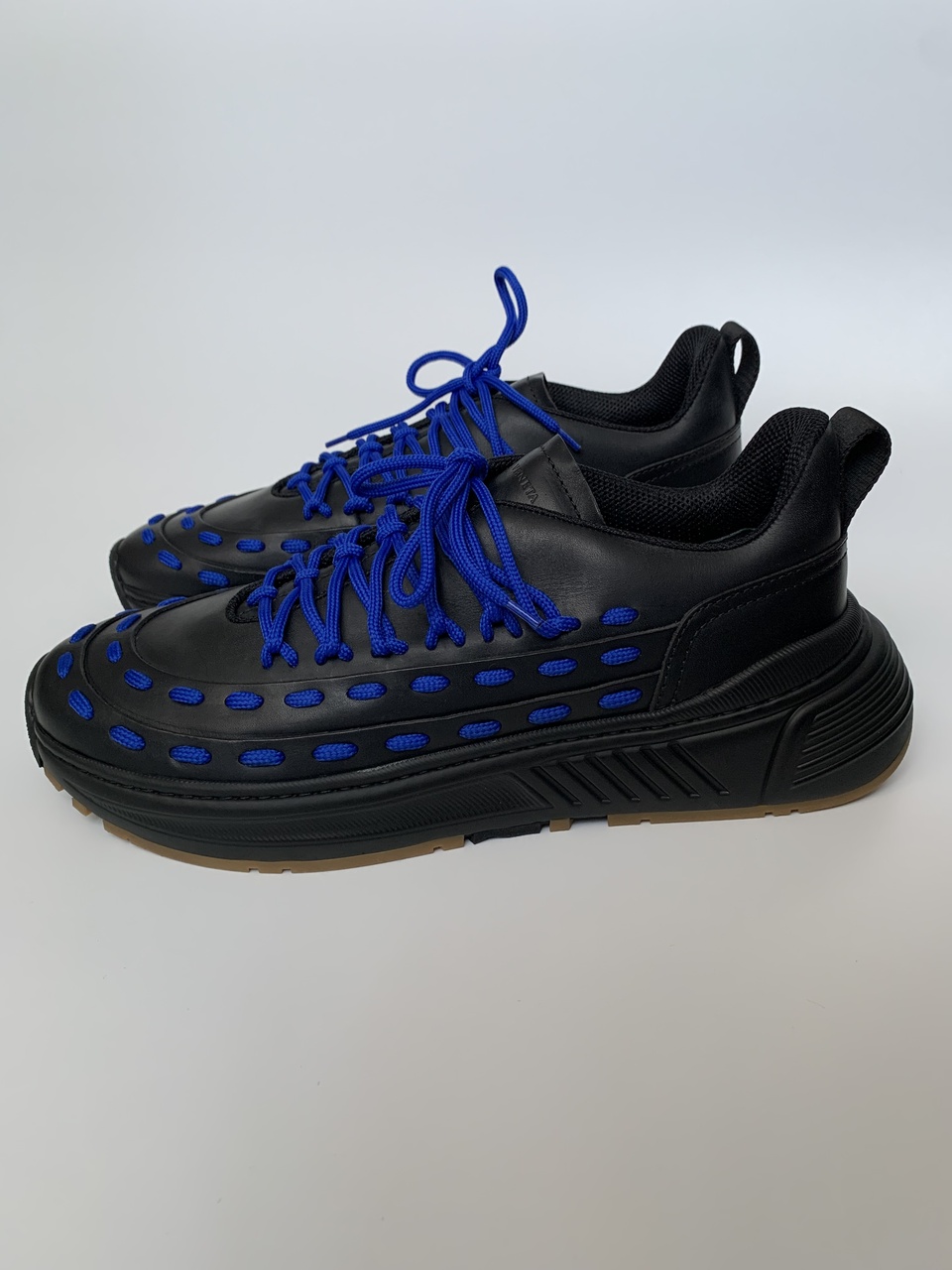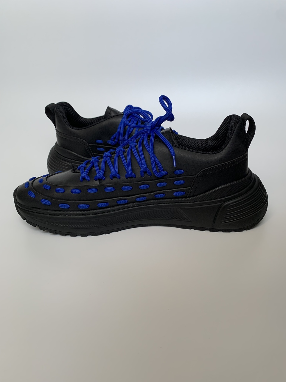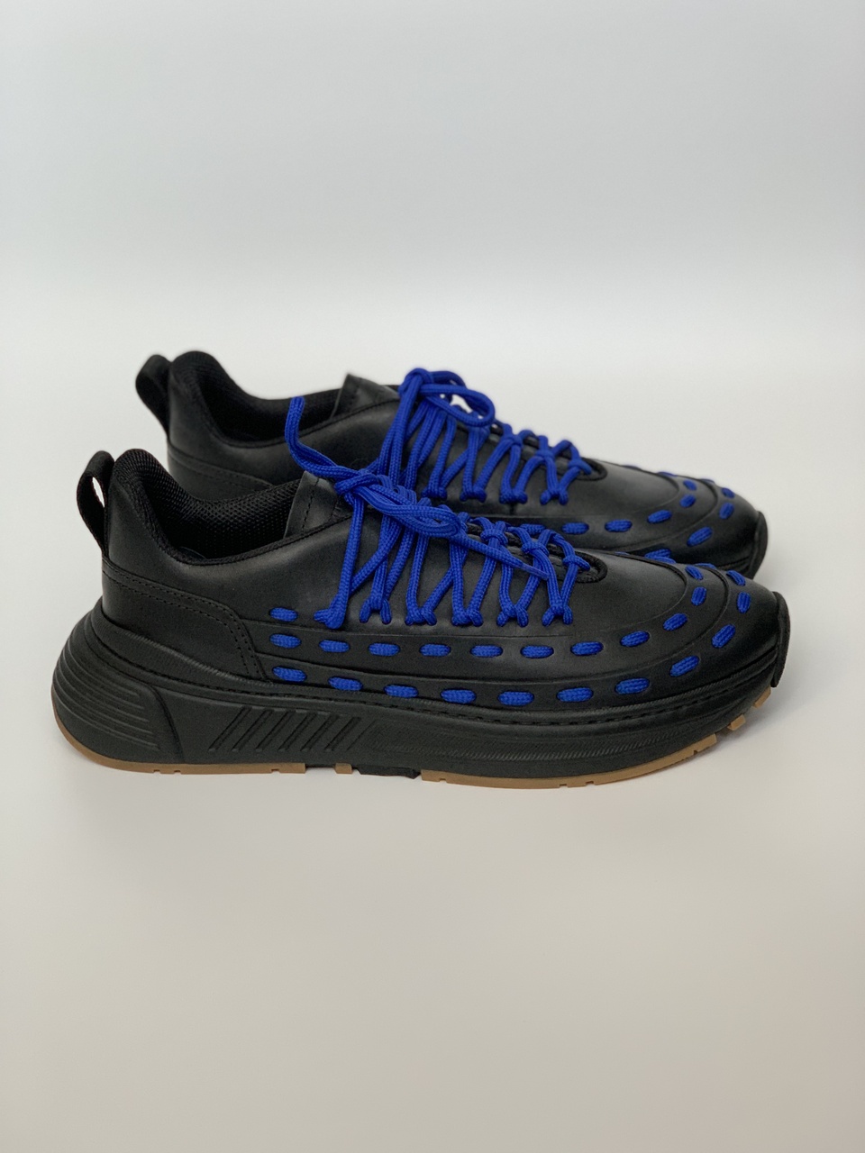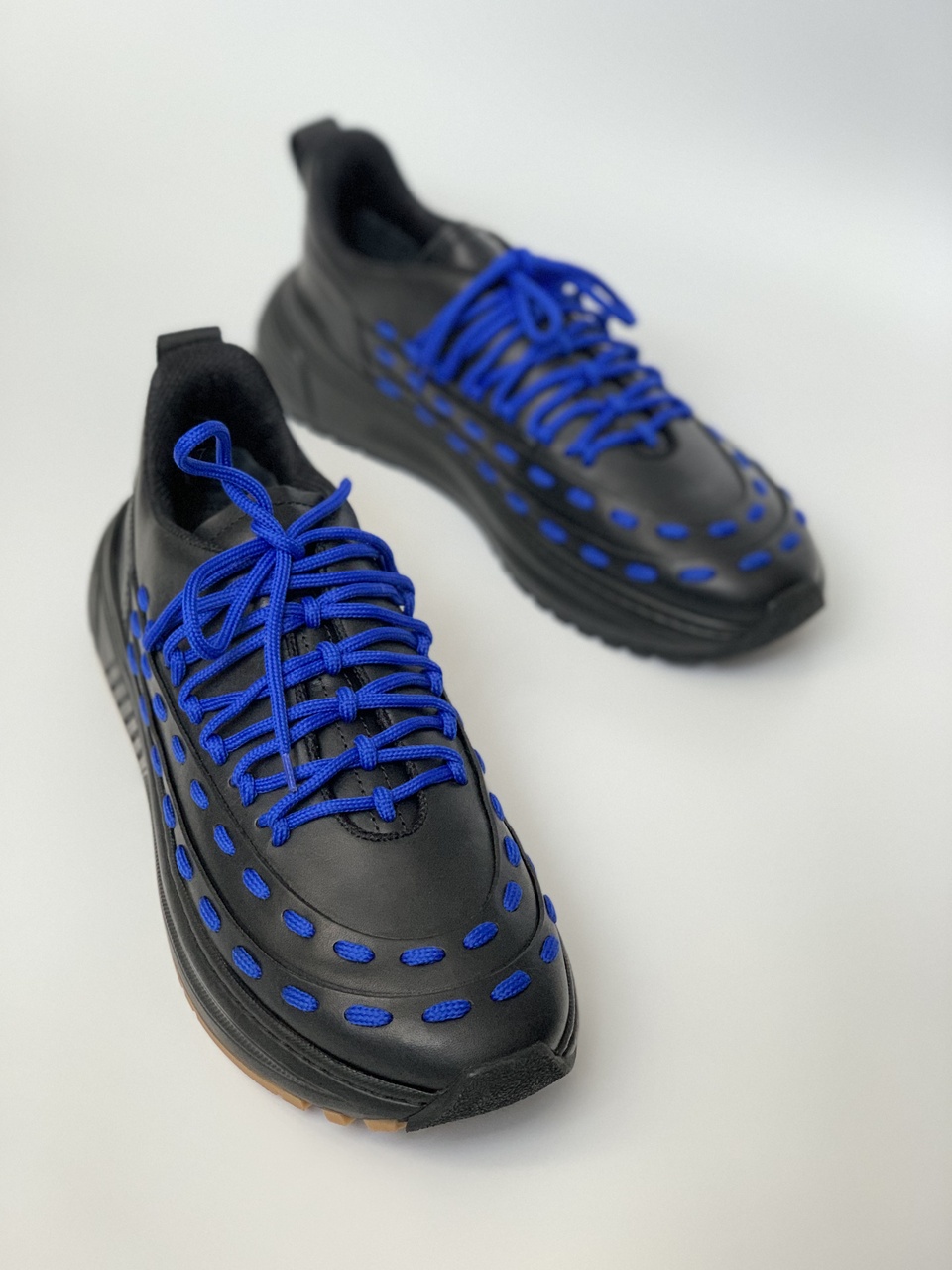 Чёрные кроссовки не выглядят просто благодаря шнуровке оттенка синий электрик и двойному стичингу ей в тон.Обувь изготовили из гладкой матовой кожи растительного дубления,поэтому она получилась особенно мягкой и эластичной.