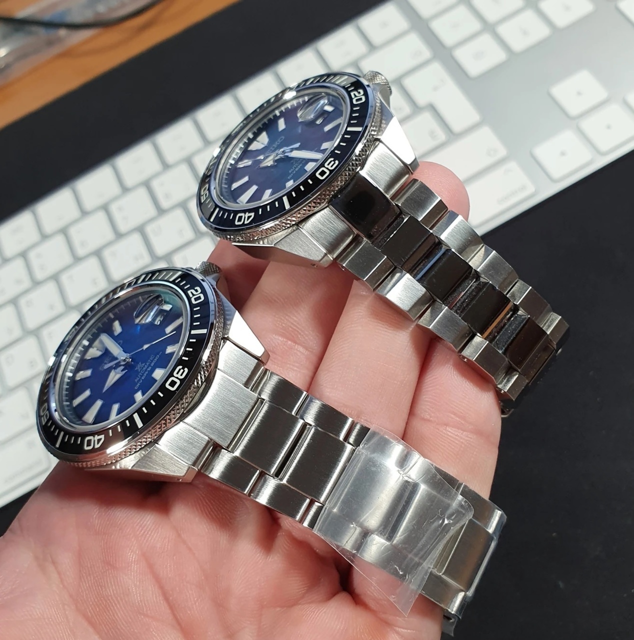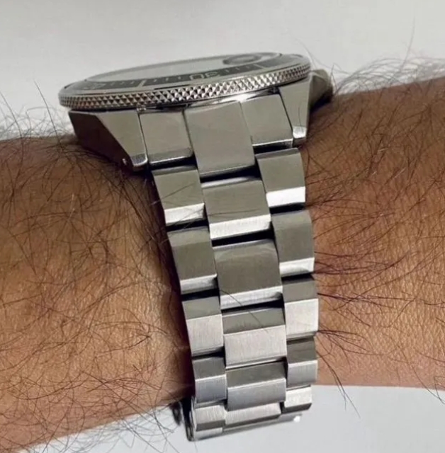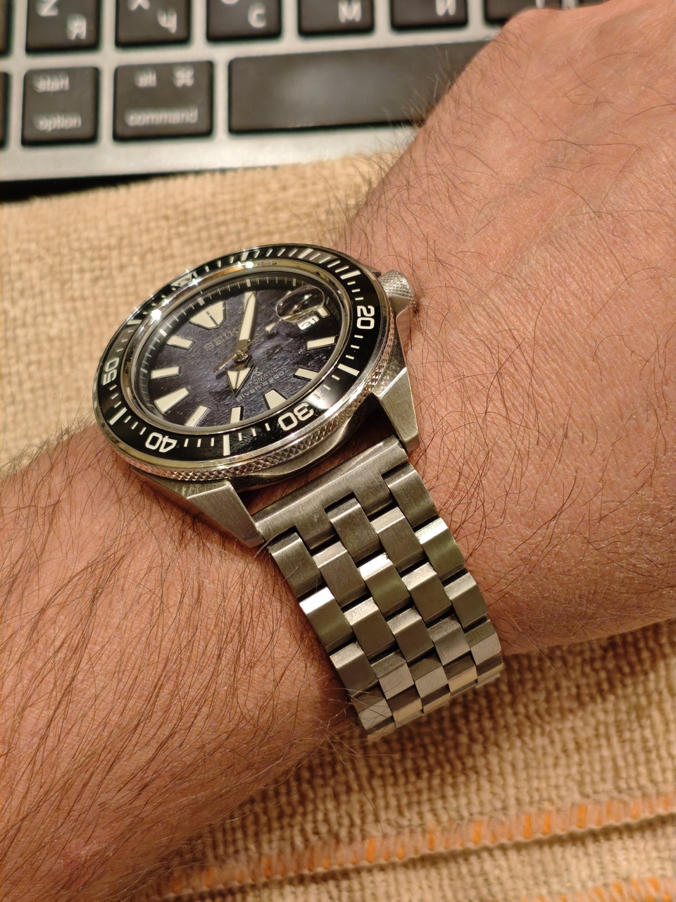 Браслет увесистый , 4.4 мм толщиной , длиной подходит на мою 22.5 см лапу . На винтах , посадил на Проксиму . Без проблем садится и на Кинг Самурай и на простой . На родные 2.5 мм шпильки .