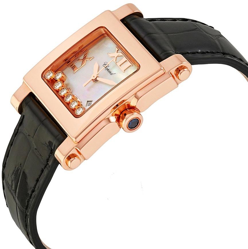 Элегантные классические женские часы с бриллиантами от Chopard представляют собой идеальное сочетание гармоничного дизайна и совершенного технического оснащения. Они идеально подойдут уверенным в себе людям с высоким социальным статусом, которые хотят подчеркнуть свою индивидуальность и изысканный вкус. Корпус часов изготовлен из розового золота 18 карат и имеет размер длина 38 ширина 30 высота 27 мм. Высокоточный надежный кварцевый механизм не нуждается в подзаводке. Часы с водонепроницаемостью 30 м перенесут небольшое случайное попадание воды. Циферблат закрыт прозрачным антибликовым стеклом из сапфирового хрусталя высокой прочности, благодаря чему обеспечивается максимальная защита от сколов и механических повреждений. Ремешок из кожи аллигатора с раскладывающейся золотой застежкой превосходно дополняет изысканный образ модели. перламутровый циферблат и 7 белых бриллиантов 0,39 карата