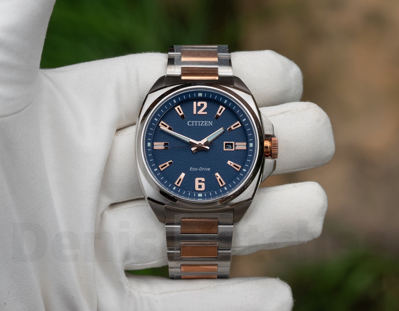 Синий циферблат, накладные метки и цифры золотистого цвета, накладная окантовка даты