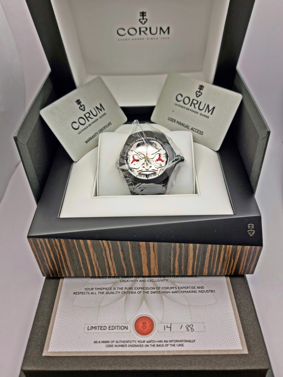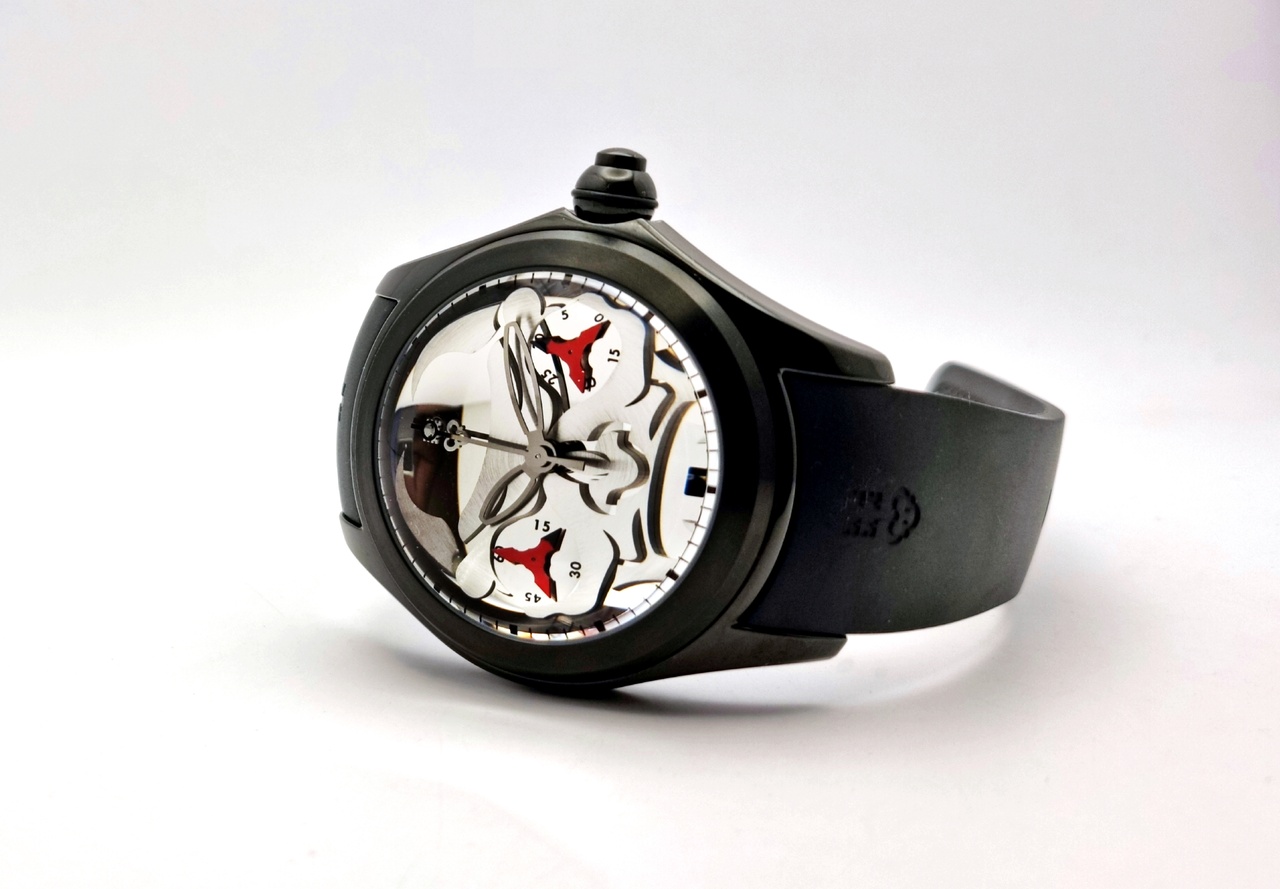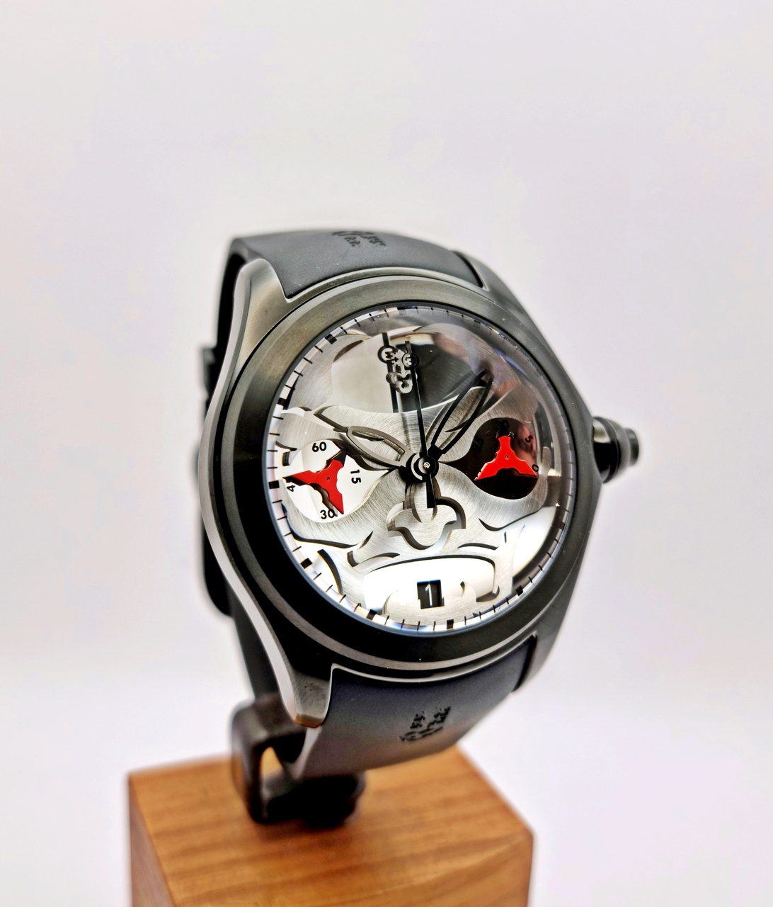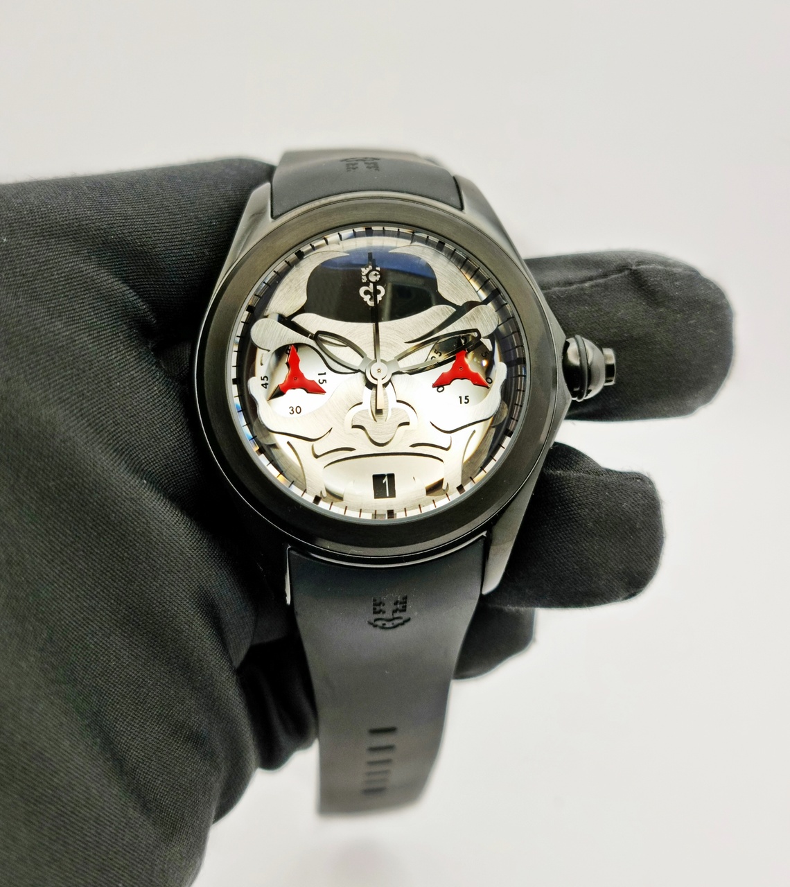 Соrum Вubblе 47 Сhrоnоgrарh LЕ 88. Лимитированная серия из 88 экземпляров. Прочный и долговечный круглый титановый корпус с РVD покрытием чёрного цвета. Сложный циферблат с различными декоративными элементами оформлен в стиле "おに Оni Моnstеr Маsk" - маски монстра, которую использовали самураи. Ажурные центральные стрелки с покрытием родием и финишной шлифовкой, дополнительные стрелки красного цвета в виде самурайских дротиков. Окошко даты находится в положении 6 часов. Прозрачная задняя крышка с сапфировым стеклом, через которое можно наблюдать работу механизма часов и ротора автоподзавода с черным финишным покрытием. Удобный каучуковый ремешок с тиснением и классической литой застежкой.
