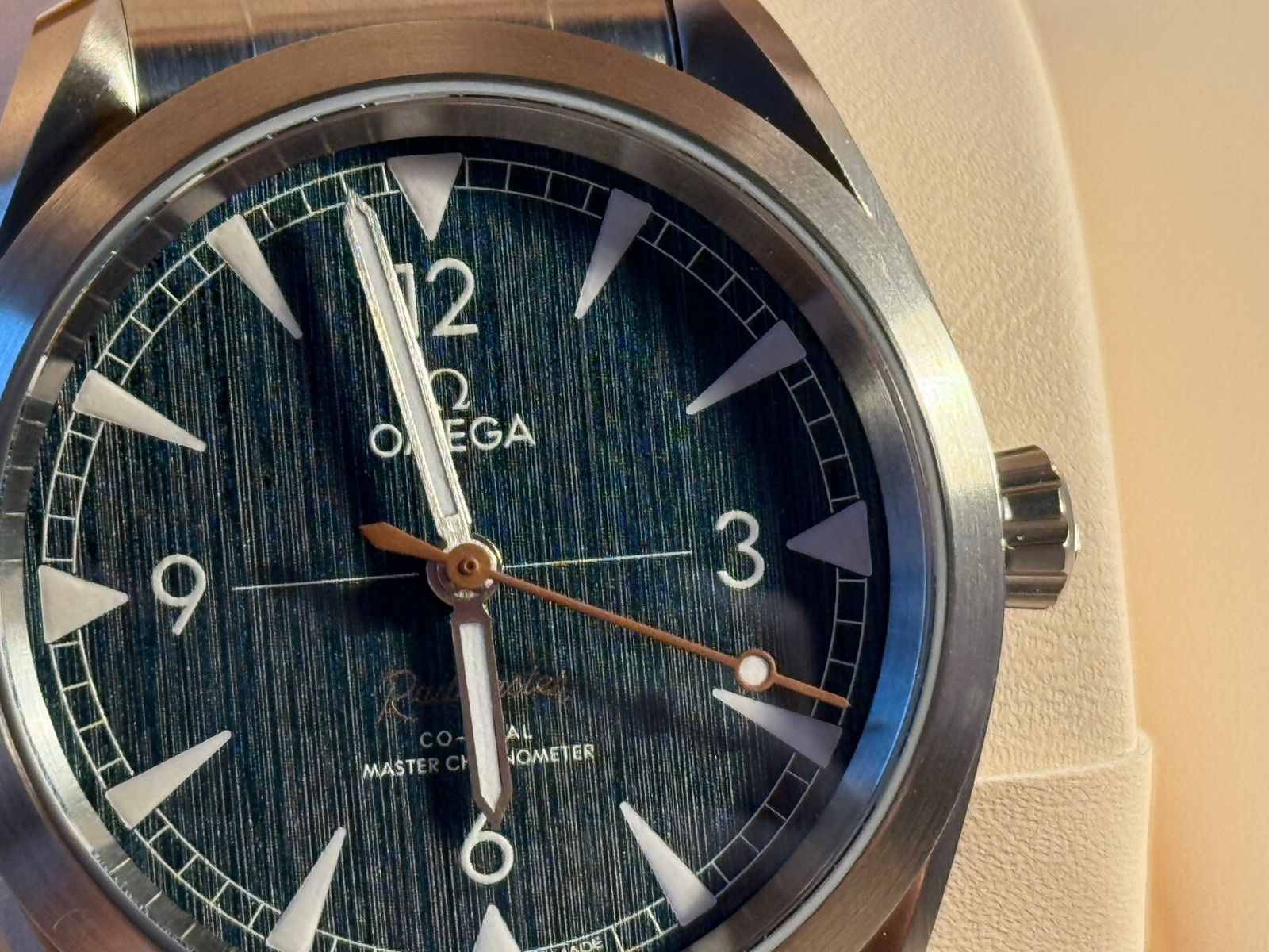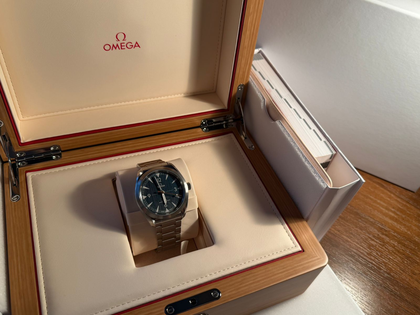 Часы оснащены мануфактурным калибром OMEGA Co-Axial Master Chronometer 8806 с 55 часами запаса хода и хронометрической точностью.