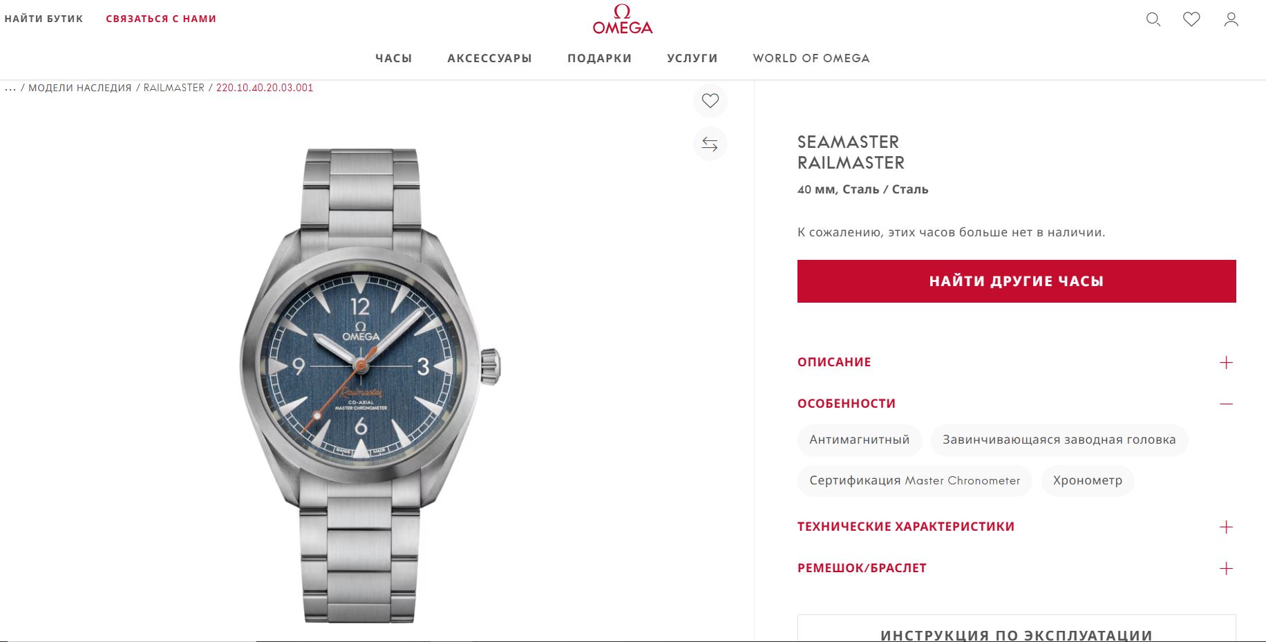 Практичные и в то же время элегантные антимагнитные часы OMEGA Railmaster были впервые выпущены в 1957 году и предназначались для сотрудников железнодорожных компаний и тех, кто работал вблизи источников электрического поля. Для современной коллекции индустриальный дух и инновационный характер оригинальных часов были актуализированы с учетом новых тенденций.