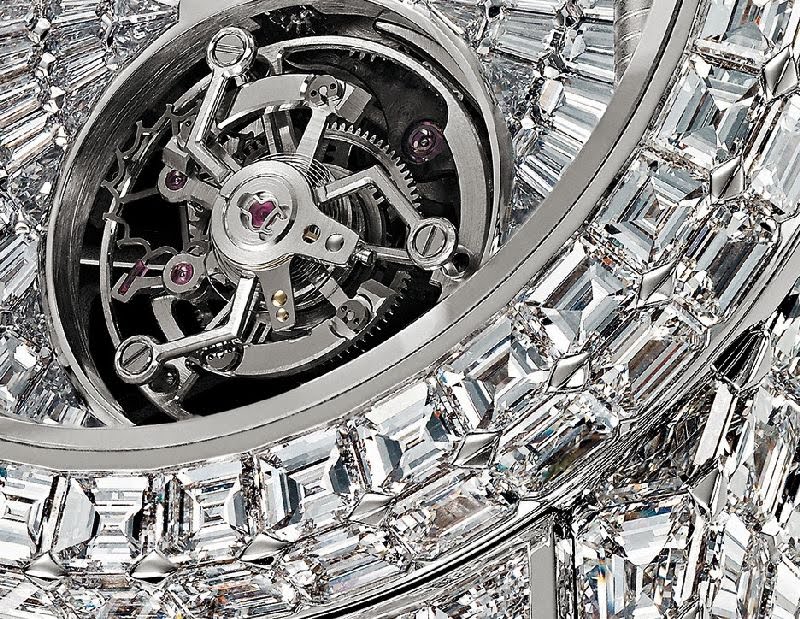 Интересно отметить, что все алмазы, использованные для украшения этой модели добыты в одной шахте в г. Якутске (РФ), расположенной на той же широте, что и Пекин и на расстоянии 9-часового перелета из Москвы. Сначала было отобрано более 270 каратов необработанных алмазов из имеющегося массива, весом 1500 карат. Затем, в течение месяца, 45 опытных гранильщиков (общие их трудозатраты составили 13000 часов) создали 637 бриллиантов багетной огранки, общим весом чуть больше 141 карата. Трудозатраты же на инкрустацию этих бриллиантов составили 2000 часов.