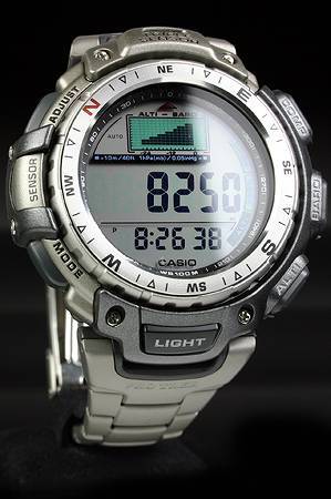 Описание часов: Электронные часы. Браслет из титана. Автоматическая электролюминесцентная подсветка. Устойчивость к низким температурам Двойной жидкокристаллический дисплей. Поворотный лимб с высеченными направлениями сторон света. Барометр. Термометр. Компас. Высотомер (до 10 000м). Секундомер - точность 1/100 секунды, максимальное измеряемое время 24 часа. Будильник (5 сигналов), ежечасный сигнал. Индикатор заряда батарейки. Полностью автоматический календарь, учитываются месяцы разной продолжительности и високосные годы. Формат времени 12/24. Водонепроницаемость при давлении 10 атмосфер.