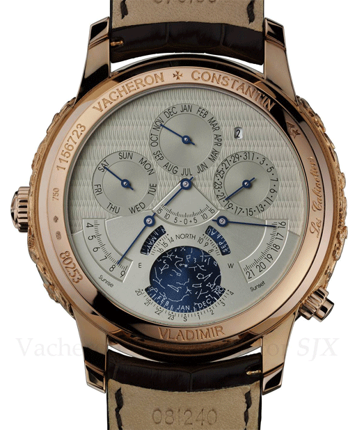 На задней крышке можно увидеть круглые указатели вечного календаря, показатель уравнения времени в центре, индикатор високосного года (на 1 часе), время рассвета и заката (на 4 и 8 часах) и карта звездного неба в нижней части циферблата.