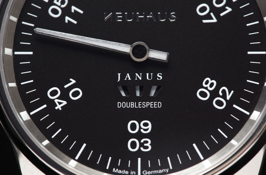 Молодая независимая немецкая компания из Аугсбурга - NEUHAUS Inventing Timepieces (создана в 2009 году), представила регулятор JANUS DoubleSpeed. Модель отличается двойной скоростью (DoubleSpeed) движения стрелки, то есть она совершает оборот 360° в течение шести часов. В связи с этим, на черном циферблате имеется двойная разметка часов арабскими цифрами (дважды по шесть часов). Причем, каждый час размечен на полчаса, четверть и пять минут. Из-за увеличенной скорости вращения стрелки, промежутки между делениями на шкале в два раза больше, чем на обычном циферблате, что существенно облегчает считываемость показателей на циферблате новинки. На белых индексах и стрелке - люминесцентное покрытие. Индикация работы часов осуществляется в апертурах на 6 часах, в которых вращаются черный и белый диски, меняя цвет каждые две секунды.