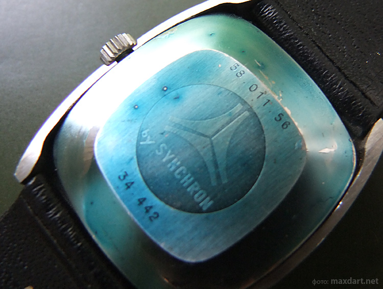- родной кожаный ремешок c логоитипом Cyma на застежке и надписью "Synchron SA Switzerland" на внутренней поверхности;