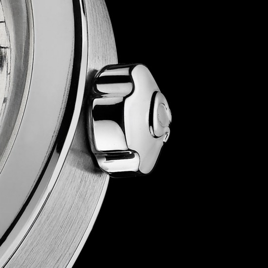 Поставляется ​​на черном кожаном ремешке с полированной пряжкой из нержавеющей стали.