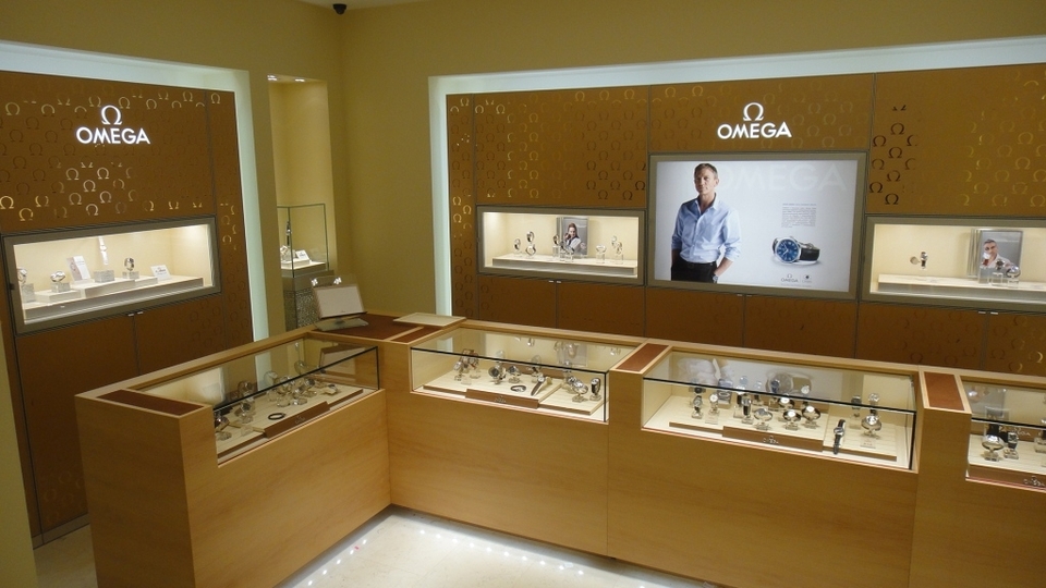 Omega придает особое значение оформлению и расположению фирменных торговых точек. Бутик в Сочи поражает своей целостностью и гармонией оборудованный согласно самым свежим и близким природе дизайнерским разработкам марки. Внутренняя отделка бутика состоит главным образом из природных материалов. Для стен использована натуральная штукатурка, для пола – мрамор. Настенные витрины выполнены из искрящегося золотом стекла и логотипов Omega.