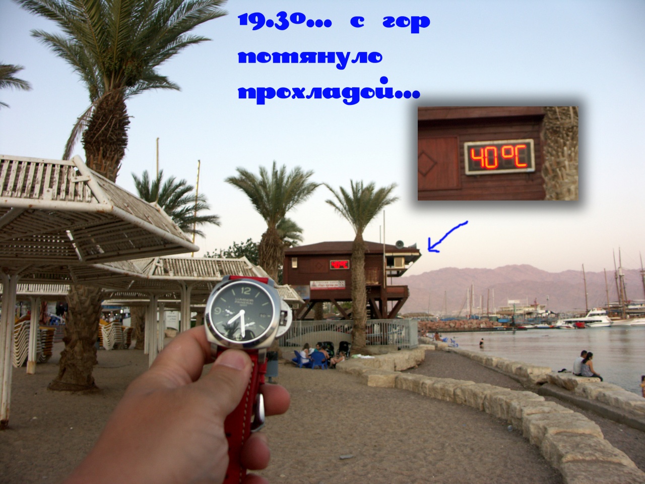 А оно, конечно, пысюн! Господа, имеющие ранки и прочий геморрой сразу вспоминают об их существовании в ласковой зеленой воде, нагретой, как и воздух, до 43 градусов. Зато фотографировать под водой просто замечательно. Поскольку фотоаппарат под водой, а голова над, необходимо сделать сто снимков, чтобы получился один. Солнце лупит так, что экрана фотоаппарата не видно. Так что непонятно – под водой снимок делается, или снаружи, на фоне зеленой тряпки. Ни тебе рыбы, ни тебе бактерий. В общем, хорошее море – Мертвое море. Надо сказать, что ПАМы всегда честно ходили купаться, никогда не филонили на берегу. Изредка переодевались с одной верхней руки на другую, чтобы не оставлять белого следа на руке. Но это и не понадобилось, потому как на таком солнце загораешь практически изнутри.
