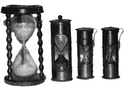 1. Песочные часы. Устройство склянки: два стеклянных конуса соединены вершинами вместе и заключены в деревянную или металлическую оправу. Между конусами через отверстия в вершинах имеется сообщение. Внутри склянки находится песок, который при вертикальном ее положении пересыпается из одного конуса в другой в установленный промежуток времени.