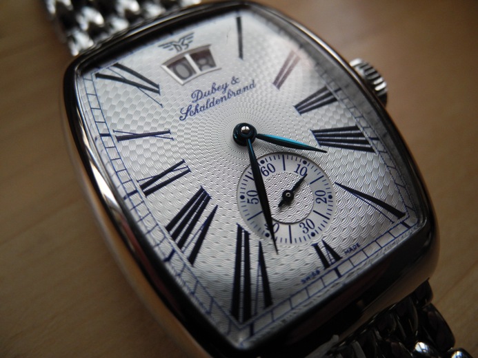 Циферблат: светлый, гильошированный; стрелки-"листок" из голубой стали; римские цифры и минутная шкала нанесены способом шелкотрафаретной печати.