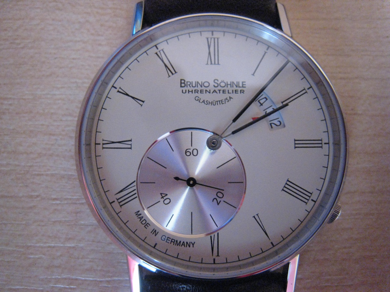 Но эти сразу бросились в глаза. Я даже не знаю точно чем они привлекли моё внимание. То ли строгостью и завершённостью своей формы, то ли циферблатом цвета слоновой кости, то ли римскими цифрами так любимыми мною, то ли часовой и минутной стрелками которые сделаны таким образом, что при мимолетном взгляде на часы кажется, буд-то бы они парят над циферблатом. А может привлекла внимание вынесенная на отдельный гильошированный серебристый циферблат секундная стрелка? Или многочисленные напоминания, видимо для тех, кто перебрал абсента после которого возможна кратковременная потеря памяти о производителе данных часов. Две первых буквы ВS названия нанесены и на заводную головку,и на ремень. Полное название выбито на застежке ремня, на задней крышке часов и с обратной стороны ремня. А может всё-таки сделанная довольно крупными буквами надпись MADE IN GERMANY? Но скорее всего совокупностью всех вышеперечисленных качеств. Лаконичность, строгость, изящество. Взяв их в руки, попытался сморщить свои извилины и хоть что-нибудь вспомнить об этом производителе, но у меня так ничего и не получилось, так как отмечалось выше , я никогда не являлся поклонником а тем более любителем немецких часов. Но, приложив их к руке понял, что именно их я и приобрету. Заикнувшись за скидку, получил от немки категоричное «найн». Спорить я не стал. Уже расплачиваясь на кассе догадался спросить что же за механизм установлен в часах. Оказалось_ обычная швейцарская кварцевая «Ронда». А я уж грешным делом подумал, что мануфактура, о чём и спросил у продавца. На что она накнопала на калькуляторе стоимость немецкой мануфактуры, от которой мои глаза увеличились до размеров стекол моих очков. Чуть позже выяснилось, что 20 евро мне все-таки скинули. Тем же вечером, вернувшись в Прагу, решил провести эксперимент о котором неоднократно упоминалось на форуме где с помощью капли воды проверяется сапфировое стекло или нет. Во избежании обвинения в манипуляциях с каплей фото данного эксперимента прилагаются. На первой фотографии капелька находится в верхней части стекла, на второй же, та-же капелька не растекаясь мыслью по древу, переместилась уже в нижнюю часть циферблата. Ну и по доброй традиции этого форума так же прилагаются фото часов на руке и без руки. А как-же Сейко и Ориент? Придет время и они все-таки появятся у меня, но это уже будет совсем другая история.