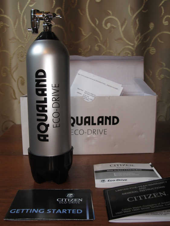 Начну с главного - в коробке действительно лежал БАЛЛОН! Такой настоящий дайверский танк, только маленький, даже подобие первой ступени изобразили (разумеется Joke, дайверы поймут). Неожиданно, прикольно. Сувенир получился потрясный! Ну а сами часы оказались внутри баллона, разумеется.